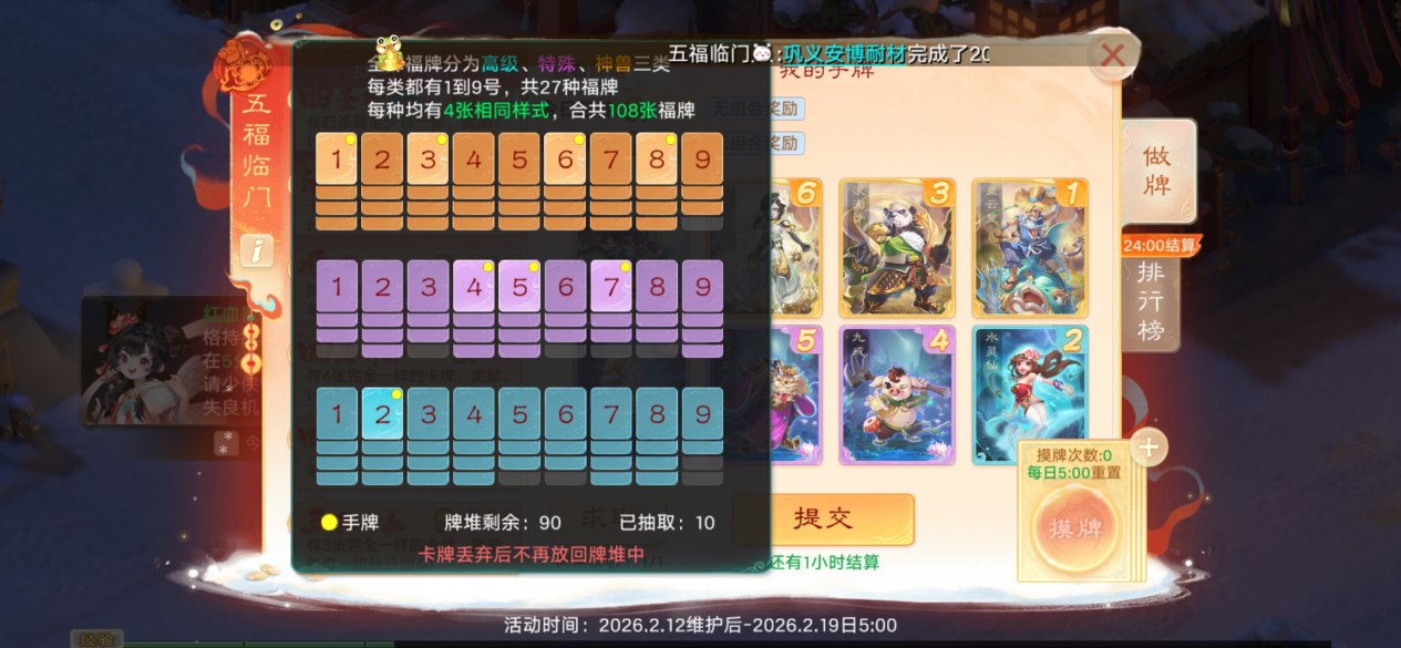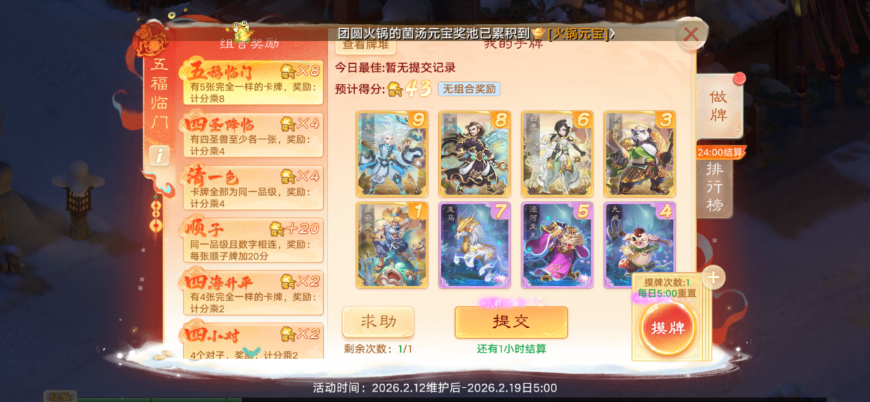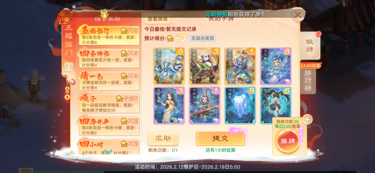 大话西游手游新春活动五福临门怎么玩?叶子猪体验下来之后,发现五福临门和斗地主玩法差不多,就是根据牌组来进行摸牌、做牌,最终福气值决定奖励。 五福临门的组合奖励跟斗地主差不多,就是要凑出来五福临门(有5张完全一样的卡牌,奖励计分*8)、四圣临门(四圣兽至少要有一张,奖励计分*4)、清一色(卡牌全部为同一品级,奖励计分*4)、顺子(同一品级且数字相连,奖励每张顺子牌+20分)。 除此之外,还有四海升平(有4张完全一样的卡牌,奖励计分*2)、四小对(4个对子,奖励计分*2)、三阳开泰(有3张完全一样的卡牌,奖励每一组计分+40)。 可以看到,清一色、顺子、对子,这些都是斗地主的玩法,大家可以根据自己拿到的底牌来进行做牌,比如叶子猪拿到的这一套牌,其实做成四圣兽“四圣临门”+四小对比较划算。 刚开始做牌我没注意到左上角“预计得分”这里,直接考虑做成了顺子,结果得分才36分,还不如刚开始的43分,亏大发了!大家记得吸取教训! 有些朋友可能不知道四圣兽是什么?这里叶子猪解答一下,大话西游手游中的四圣兽是青龙、白虎、朱雀、玄武,它们源自中国古代神话中的四方神兽,分别镇守东、西、南、北四个方位,在游戏中被设计为珍稀召唤兽或时装主题,兼具文化象征与高阶战斗价值。 游戏规则很简单,每天有10次摸牌机会,摸完之后可以选择丢弃或替换手牌,初始卡牌库共有108张,抽卡为不放回抽取。每天做日常活跃、参与八骏争春玩法、打卡春节景观都可以获得抽卡次数。 大话西游手游五福临门最终结算的话,是根据我们8张手牌上面的数字相加,计算出基础福气值,最终福气值=基础福气值*组合奖励倍率+组合额外得分。 每天的求助次数也记得利用起来,向好友求助,即可复制其拥有的一张卡牌,沾福卡是达成五福临门组合的唯一途径。大家看看排行榜一、榜二这些就知道了: 基本都是凑成了五福临门,五张相同品级的卡牌,计分直接乘以8,这是得分最高的方式,换句话说,没有五福临门你甚至都上不了榜。 第一名这套卡牌就是凑够了五福临门、四圣降临、清一色、顺子,积分直接翻倍,达到了8528分高居榜一。第一名奖励五色珍露和五福福星礼包,有机会几率哦,建议大家都尽量争取一下排名靠前。 以上就是今天的所有内容,更多大话西游手游春节攻略,大家可以加入叶子猪大话手游交易服&交易群,组队分享、搬砖交流、春节唠嗑,都可以来这里哦~ [编辑:ssc]