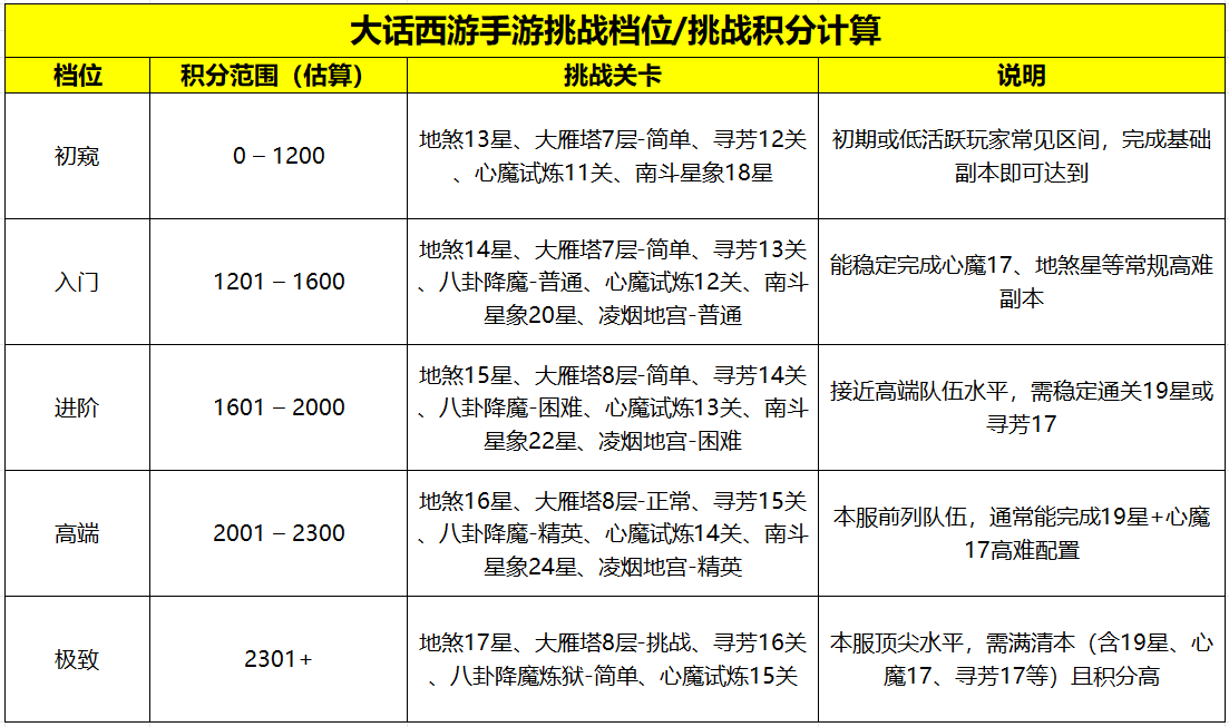 大话手游挑战档位怎么划分?大话手游挑战积分计算规则?搬砖挑战奖励要拿几档?大话西游手游挑战系统的档位奖励调整之后,一二档玩家心态都崩了...... 以前二挡保底120万银两,现在只给了一个星芒,还有玩家二档就给了两个凝魂丹,300万师贡之类的,搬砖党想要保证交易服收益,最少也要挑战三档四档奖励了。 还有玩家测试了一下挑战袋子开箱,存了12个银袋子,结果6个给的都不是银两,真是感觉天都塌了!挑战系统第1至第5档的日结奖励优化了,虽然遏制到工作室的自动化刷分行为,但少了银两袋100%产出银两,搬砖日子也不好过了。 这样的话,大话手游交易服顶尖队伍一档二档,其他人躺平三档四档,五档六档挂机指定回不了本,银子是一方面,周累计有几率给残卷、龙骨、见闻录、聚魄丹这些东西。 叶子猪要告诉大家的是,这个不是什么官方暗改,在维护公告里面都有写到,为了抑制银两货币的膨胀速率,对银两总投放量进行了一定程度的缩减。 1~4档奖励调整为投放竞技礼盒,开启后必得可观银两以及师贡,同时有机会获得终极残卷、高宝图、见闻录、聚魄丹等奖励,整体价值上来说的话,其实是比原来挑战档位奖励提升了超过40%价值。 换句话说就是,到手的银两少了,但是珍稀道具多了。大话手游挑战档位怎么划分?大话西游手游的挑战积分系统在2025年5月改版后,将挑战等级划分为初窥、入门、进阶、高端、极致五个等级,每个等级对应不同的积分区间。 单个活动(如完成一个副本)在不同等级间相差 20分,且每周一5:00重置积分与排名,排名档位按本服固定百分比划分,叶子猪这里为大家整理成了一个表格,有用记得收藏起来! 4档及以上(即高端和极致)可获得银两袋子奖励,金额随机为250万至600万银两,对于大话手游这个挑战档位奖励的调整,你是怎么看待的呢?可以加入叶子猪大话手游交易服&交流群,我们一起来探讨一下怎么搬砖。 [编辑:ssc]