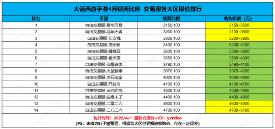 大话西游手游2026各区银价排行,大话手游4月银两比例排行,哪个区银两比例最高,大话手游4月银价今日银价怎么样?近期,随着官方对交易服经济进行调控,银两消耗结构与投放机制优化,长安城等各大区银两比例显著回落! 下面,叶子猪为大家整理了2026大话手游各区银价排行,交易服4月最新银价查询看这里: 可以看到,各大区银两兑换比例(即“银价”),今日银价普遍回落到3000-3500万银两区间,银价呈现上涨趋势。注:比例数值越小,代表银两价值越高。 特别是长安城银两收购区间,稳定在3200万~3900万 / 100元,要知道这个老牌大火区,作为首个交易服经济最为活跃,之前银两比例一度飙升到4000甚至4100比例。 第一梯队(3150-3500): 包括“春华万卷”、“马年大吉”等前7名区服。这些区服的银两比例稳定在3500以下,属于高价值区。这意味着在这些区服,银两相对稀缺,购买力更强。 第二梯队(3970-4300): 以“大圣娶亲”、“点石成金”为代表。比例在4000左右徘徊,属于中等价值区,市场供需相对平衡。 第三梯队(4400-4700): 以“二零二六”等结尾的区服为主。比例突破4400,属于低价值区(银两相对贬值较多),高风险高收益并存。 大话手游交易服目前一共有14个交易区服,从叶子猪整理的数据来看,春华万卷作为3月24日最新的交易大服,银两物价是最为稳定的,3000比例就能兑换100RMB,马年大吉紧随其后; 其他接下来就是这一批最早开服的服务器:长安城、洛阳桥、蟠桃园、傲来国,都是3500万/100元左右的银两比例。可见大话官方这一次调控措施,对老区经济系统起到了一定的稳定作用。 相对于第二批、第三批开放的区服,老区比例一直比较坚挺,银两产出和消耗控制比较完善,官方将师贡消耗改为银两后,玩家需消耗更多银两升级技能,形成“消耗-产出”良性循环; 这一点有“年度服务器”之称的二〇二六/二零二六,就很难短期内做到回落,银两比例还是在4000以上,甚至飙升到了4600/4700这样的银价水平。 大话西游手游2026最新礼包码: 【大话春日福利放送】 【大话手游发福利】 【春日福利】 【福利同行】 以上就是今天的所有内容,大话西游手游一亿大话币价值多少,大家自己估算下就明白了,至于说哪个区银两比例最高?那肯定是最新开的【春华万卷】,可以进群一起来搬砖。PS:需要其他各大区交易服&交流群,找群主叶小猪拉一下就行。 [编辑:ssc]