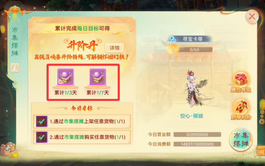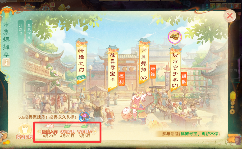 大话西游手游市集摆摊季是一个“获取银两”的好机会,活动一共有三期,4月23日熙攘人间、4月30日休闲假日、5月6日千家筑梦,核心玩法就在于“摆摊交易”赚银两! 大话手游第一期熙攘人间,4月23日维护后开启,包括情缘之约、惊喜寻宝卡、市集摆摊、坊市守护者四个玩法,下面叶子猪为大家带来详细攻略。 一、情缘之约免费拿寻宝闪卡 情缘之约是很简单的签到活动,每日上线点一下就可以了,5月1日开启补签,除了获得一些常规的奖励道具,第八天签到,还能拿到一张寻宝闪卡,累计签到4天也能拿到一张寻宝卡~ 这个闪卡作用可大了,5月6日10点可以刮奖,100%必定中奖,最多可以全部拿下刮奖区的8个奖励,还有概率获得五常神兽。 二、寻宝卡怎么玩?抽奖必中奖励 我们每日150活跃获得的2张寻宝卡,每张寻宝卡均有8个刮奖区域,这个不用再考验你的手气怎么样,属于抽奖必中,运气爆棚可全揽8份奖励! 绑定的寻宝卡,只能自用刮奖,当开奖区域图案与中奖图案一致,就会获得相对应的奖励,比如叶子猪大话精灵中了三个,狐小妖中了五个,美滋滋啊! 寻宝卡通过活跃度奖励、坊间守护者活动可以获得,市集摆摊也可以不限购购买,买到之后,非绑定寻宝卡摆摊上架,出售给其他玩家赚取银两差价,轻松实现银两自由~ 三、市集摆摊赚银两,还有升阶丹! 市集摆摊完成每日目标(上架/购买货物),只要累计3天、7天,就能获得免费的升阶丹,用于给高级召唤兽升阶成特殊宝宝,解锁怀旧幻肤。 然后市集摆摊也不难,如果你没有一早就上线抢位置,那就成为行脚商人随行摆摊,畅玩服仅可出售非珍品道具,而且仅能按照推荐价格上架; 自由交易服可以出售非绑定道具,寻宝卡系统推荐是售卖50万银两,隐身药是14.9万,小小赚一笔还是挺不错的。 四、坊间守护者体验全新回合制 这个是官方本次推出的全新回合制玩法,叶子猪体验了一下,还蛮有意思的,一共要抵挡10波怪物,主要盯着商店购买技能、装备即可,初始技能有雷霆、灵光、剑气可以选择。 作战过程中,因为装备栏格子是有限的,所以建议商店有了金币之后,优先升级自己的技能,比如叶子猪到第10波怪物,灵光也已经升到10级了。 只有你和队友全力配合购买新装备、升级主力技能,才有可能撑到第10波怪物,碰到挂机的队友很难撑到后面。不过通关奖励也很丰富,除了寻宝卡,还能拿到五行神兵,聚魄丹见闻录等等。 以上就是今天的所有内容,有想知道怎么赚取更多银两的朋友,可以加入叶子猪大话手游交流群&交易服,组队搬砖、物资信息、自由买卖,这里都有~ [编辑:ssc]