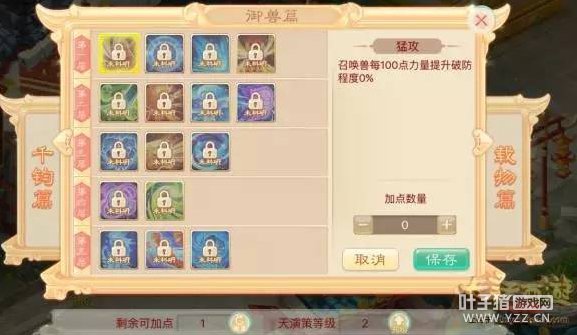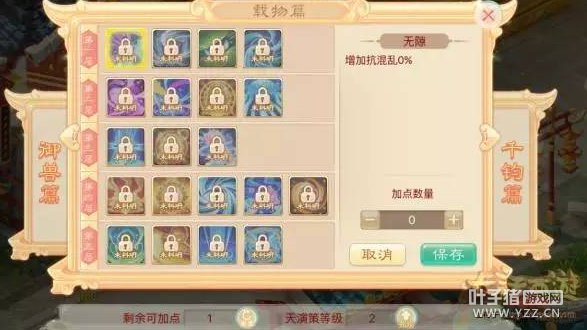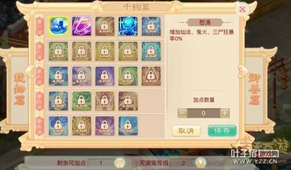 【千钧篇】 第一层 怒涛:增加仙法,鬼火,三尸狂暴率X%; 狂魔:增加忽视抗震慑X%; 破军:增加破防概率X%,破防程度X%; 凝神:增加加强冰混睡忘X%; 诛神:对召唤兽忽视仙法,鬼火,三尸,毒,震慑增加自身的X%,忽视冰混睡忘增加X%。 第二层 克木:增加强力克木X%; 克火:增加强力克火X%; 克土:增加强力克土X%; 克金:增加强力金木X%; 克水:增加强力克水X%; 第三层 攻心:每逢5的整数倍回合,单法伤害增加X%。其他回合PVE战斗增加X%。PVP战斗不增加; 堆月:对已处于魅惑,毒的单位继续释放相同法术,可叠加X%/X%的效果(最多叠加5层); 精妙:增加命中率X%; 枯荣:牺牲20%的速度,忽视冰混睡忘增加X%,忽视仙法鬼火三尸毒震慑增加自身X%; 饮血:(仅PVE)每次控制法术命中,恢复自身(命中率位数*X%)的最大气血,每次人物或所属召唤兽击倒目标时,恢复自身(击倒单位数*X%)的最大气血; 第四层 乘鸾:受到攻击时,若自身未处于加防状态,则有X%的概率进入加防状态; 御风:受到攻击时,若自身未处于加速度状态,则有X%的概率进入加速状态; 冲冠:受到攻击时,若自身未处于加攻状态,则有X%的概率进入加攻状态; 千刃:破防程度增加X%; 第五层 气定沧海:释放冰混睡忘时一定几率增加2点忽视,血量百分比越低几率越高; 金石为开:每施展一次仙法,鬼火,三尸,毒,震慑,无视掉被命中目标对应抗性的5%,最多50%(中断一次,则效果清空); 飞花溅玉:物理攻击有一定几率3倍暴击,一定几率隔山,隔山伤害为80%; 浩气凌霄:释放仙法,鬼火,三尸,毒后,若目标有濒死单位则有一定几率二连击,连击伤害为正常的30%。