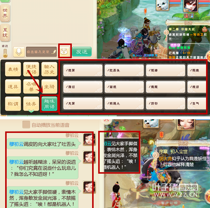 更新后,在情系今生、相聚长安、紫陌红尘服务器抢先推出了趣味用语玩法的体验! 作为忠实的“狗仔”,娃娃必须去八一八这种新玩法! 先来说说聊天框内的趣味用语吧,找到“趣味用语”选项后即可浏览到所有的趣味用语指令; 聊天框内的趣味用语有很多选择,小伙伴们可以自己体验其中的趣味,娃娃就不一一赘述了! 今天要和小伙伴们分享的是趣味用语的趣味指令玩法:在聊天框内输入 “/动作指令”(如 /攻击), 正确的话角色将会做对应的动作哦! 下边这些是娃娃用没转个各个种族体验的“/攻击”“/施法”的效果图,是不是很好玩呢? 前对NPC只能看,现在可以动手揍了!你有木有看哪个NPC不顺眼很久了,去揍他吧,揍到你开心为止! 大家还可以开发更多有趣的玩法,比如两人对打,夫妻情趣,队伍一起做这些指令~都很有意思哦!以上内容目前只在测试服开放,相信很快就能全服更新啦! [编辑:小羽]