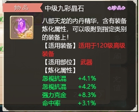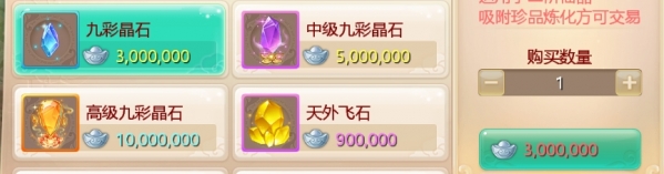 高级九彩晶石:购买1000万,晶石吸附装备炼化500万,总共1500万。 9、如果是购买晶石给装备上炼化,收多少钱? 答:根据九彩晶石的不同等级有所区分。九彩晶石300万,中级九彩晶石900万,高级九彩晶石1500万。 10、九彩晶石在哪里买卖,有时间锁吗? 答:九彩晶石通过多宝阁交易,分类在左侧最下方,天策符的下方,分类内按炼化来源的不同部位细分。交易后的九彩晶石会自动加上30天的时间锁。 11、炼化赋予时,装备和九彩晶石上的时间锁怎么算的? 答:两者有一个有时间锁时,赋予后的装备带时间锁,时间继承;两者都有时间锁时,赋予后的装备带时间锁,时间继承最久的;两者都没有时间锁,赋予后的装备自然没有时间锁。 12、不同部位的装备的炼化可以混用吗? 答:不可以,炼化只能在对应位置的部件之间转移。 13、不同等阶装备的炼化可以混用吗? 答:请参考第六问的回答,炼化只能从低阶装备转移到高阶装备,并且会有珍品变为非珍品的可能。 14、为啥大力属性的炼化算不上珍品? 答:目前版本仅三大力的属性算作珍品,该玩法仍在测试,不代表最终开放时的设定,相信后面开发大大们会有更多的改进。 15、为啥时间服没有高级九彩晶石? 答:通过对比发现,九彩晶石和中级九彩晶石已经覆盖了时间服的高端装备,高级九彩晶石暂无空间,捕快个人猜测高级九彩晶石可能对应140级高装,但是暂未开发,未来请大家关注开发大大们的公告。 16、炼化吸附功能到底有啥用? 答:目前来看,最重要的功能便是炼化交易,把自己用不上的超极品炼化换成银两,回血继续买买买,其次便是炼化储存功能,方便玩家储存多套炼化,便于变更套路时以较低的代价切换装备属性。不过由于珍品炼化的条件过于苛刻,很难在短期内积累大量珍品炼化,只能储存普通的炼化备选,当然对于不缺钱的高端玩家,这都不是事儿。 17、现在市场上有什么不错的炼化吗? 答:捕快目前收集了几个,小伙伴们可以参考一下。 首先是免费服的几个九彩晶石。 然后是时间服的几个九彩晶石。