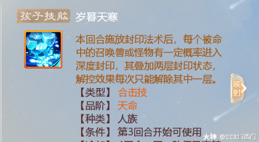 最后一种套路就是双控制套路,这个套路相对来说就比较简单了,例如冰+遗忘套路来说 男人孩子技能千里冰封、鬼族孩子技能三生无石,这俩技能都是释放群里法术有概率目标+1,对于这个游戏来说 不能所有法术都抗所以如果一旦被试出抗性,双控制的套路也很难被翻盘。