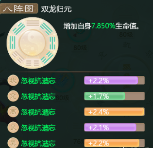 配饰属性推荐 披风戒指以双敏双根骨为最佳,腰带挂件以双敏单根骨为最佳 举例来讲,炼化加配饰属性的根骨大概为衣服24+帽子24+鞋子30+披风30+戒指30+腰带15+挂件15=168,加上目前等级181的自带属性刚好是装备的350根骨属性需求,不会超过,也不需要非太大资金购买纯敏物资。 三、八阵图 八阵图的洗练是一个大工程 ,但对于时间服友好的多(你懂的~) 控制三阵法五方五老、奇门五转、五岳威严。其中“五方五老”是最实用的。 下面看下阵法对比: 其实大多数小女鬼应该和我一样,五项洗练为忽视抗遗忘,但不能全部达到紫色和黄色。 |