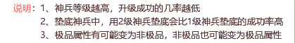 大神回复:神兵升级后属性必定提升,但是普通属性有几率变成极品属性,极品属性也有几率变成普通属性。并不是一成不变的,极品就是极品,普通就是普通。