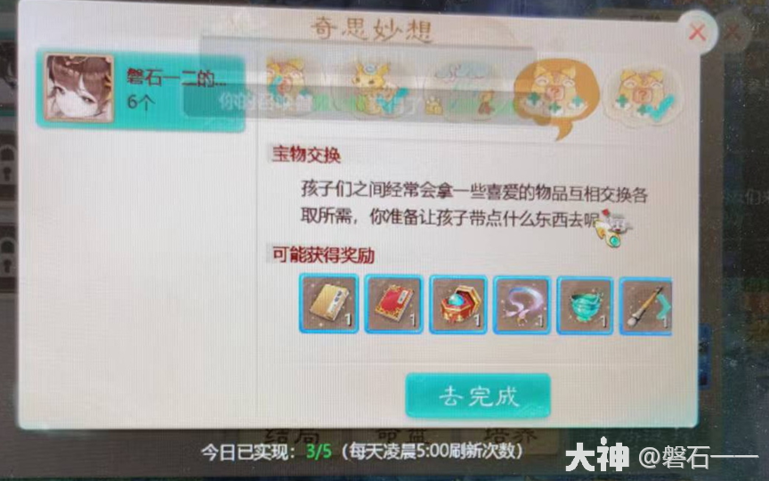 又一个大家忽视的问题。孩子的奇思妙想。很有用,能省很多钱。 分类也比较多。最好的就是给坐骑技能熟练度100这个。坐骑技能熟练度8W以前可以用流光碎溟(跨服帮战给的),8W-10W就的用丹书密卷,10W以上只有在站斗后有几率给1点,现在能给100点是非常多的。 虽然是给随机的坐骑,也不错的。平民4坐骑技能熟练度8W靠时间就可以弄到,8W-10W用丹书密卷1个技能大概是1组,有实力的也可以弄到。 还有人问我平民孩子怎么样,这个很简单的,提前准备逍遥符,每个星期郭氏积分换10张,慢慢攒够350张左右,然后开始心愿模式,算着每个够1000就行了,先弄名气,再弄其他,名气够900多就行了,差的靠吃道具补齐,我刚开始2次就是没算好,都是差几点就够999,后来就用逍遥符到1000左右,最后再吃符的,一定要算好,多用1张符没事。 1,免费1W宝宝亲密。 2,坐骑经验 3,白给物品 4,坐骑技能熟练度100 5,用%的药换孩子道具。 6,用圣兽丹换孩子道具,可以用绑定的换。 7,可以用神算子买卡3张,师门贡献9W,换1个孩子用的道具,道具最低也是10W师门贡献以上。 8,用中级九彩换孩子道具。可以用绑定的换。 9,洗练信物,有几率给五色石 10,给宝宝经验 11,估计是易容的。 12,洗变色用,没洗过。 更多游戏攻略,请关注叶子猪大话西游手游官方合作专区。 [编辑:叶子猪小秘书]