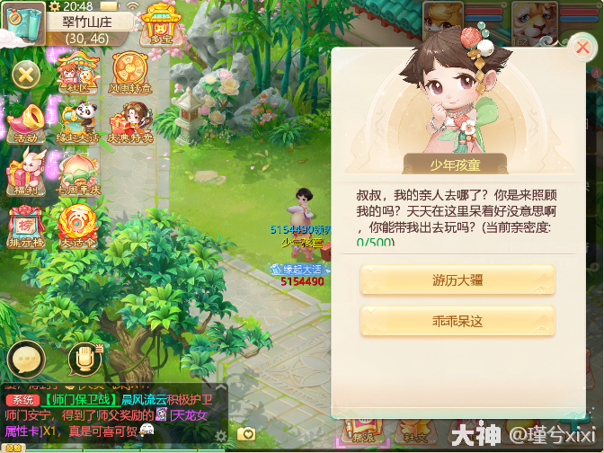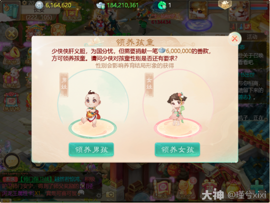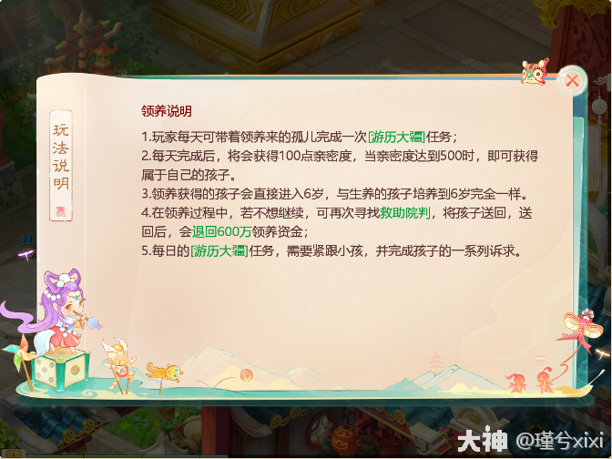 可能很多新来的老铁觉得玩养育孩子一定得需要另一半才可以,其实老铁们只知其一不知其二,今天用一文攻略来给大家讲讲如何在没有另一半的前提下,依然可以培养自己的孩子。 一、领养孩子 首先不论是单身或者已婚都可以去皇宫门口寻找救助原判领养孩子,首先需要600万银子,男女只是形象不同,对技能没有什么影响。 二、游历大疆 (1)剧情任务 领养了之后需要回家做任务,接受任务后找管家花费50万采购物资,然后就开始了当天的任务,一共五天,每天都有14个任务 任务类型 买东西,孩子在游历过程中会出现各种突发事件,需要买金疮药、竹蜻蜓、野餐篮,花费50万 战斗,如图,甲乙丙丁戊己庚辛壬,按照98、87、76、65......的顺序依次普攻即可 答题,题库范围也很广,需要连续答对五题。 关爱老人,给20万银子 (2)耗时与花费统计 Day 1 时间:15分钟,银两:184210361-171910361=1230万(包含领养600万) Day 2 时间:13分钟,银两:171910361-168310361=360万 Day 3 时间:16分钟,银两:168310361-163410361=490万 Day 4 时间:18分钟,银两:163410361-154210361=920万 Day 5 时间:13分钟,银两:154210361-148010361=620万 合 计 时间:75分钟,银两:3620万 (3)注意事项: ①如果不想领养了可以寻找救助院判,600万可以退回 ②游历大疆任务需要紧跟小孩,不跟着小孩的话突发事件增多,买东西的次数会增加(第四天测试数据得出) 以上就是全部内容,希望本文能对你有所帮助,更多游戏攻略,请锁定叶子猪《大话西游手游》官方合作专区。 [编辑:叶子猪小秘书]