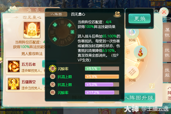 防守类:四无量心 由巽,兑,坎,震位组成。由于五蕴皆空完美激活条件需要整体40级以上才能激活,很多新区的朋友达不到那个要求,所以可以激活这个。不过这个只有PVP战斗才生效,效果跟五蕴的区别就是受到控制的同时也会降低效果!不过只需要整体30级就可以激活!一般会在乾,坤位没有合适属性的时候会选择这个,有利有弊吧算是!一般由站桩单位选择激活。