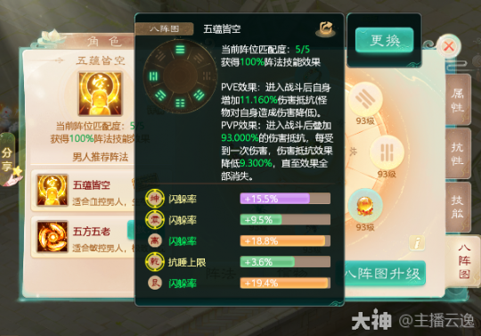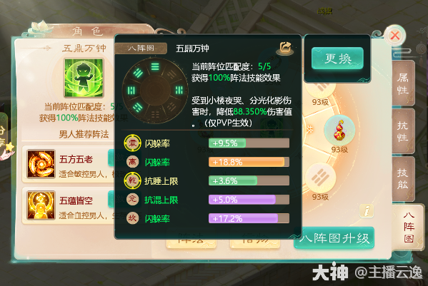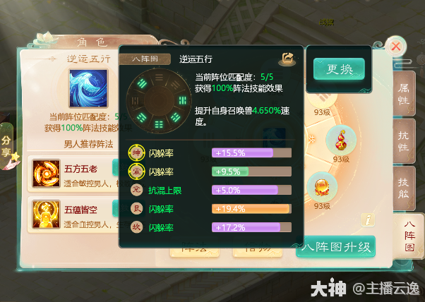 2.辅助类:逆运五行 由坤,震,兑,艮,坎位组成。这个阵法是辅助类阵法收益最直观的!任何时候都生效,提高自身召唤兽速度,八阵图等级越高,提升的越多!常见于高敏男魔,女鬼。或者低敏站桩男人激活。