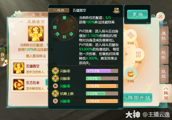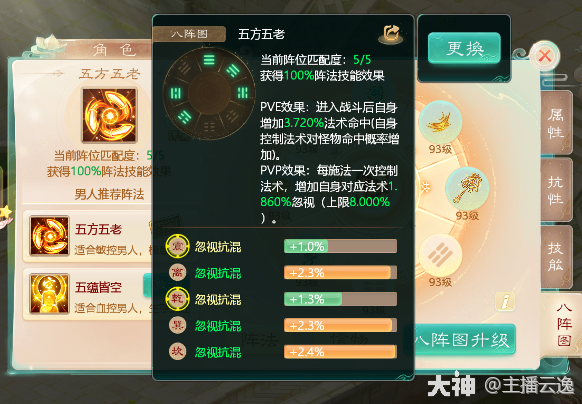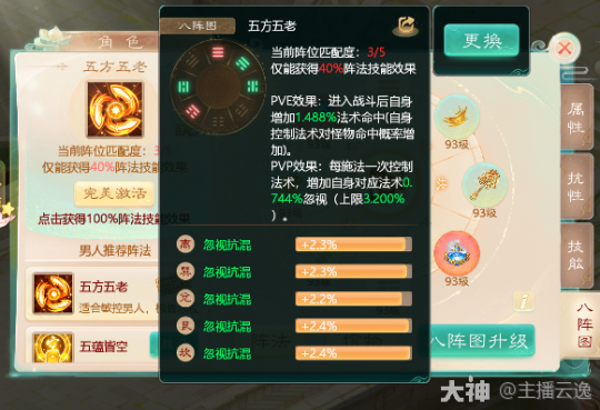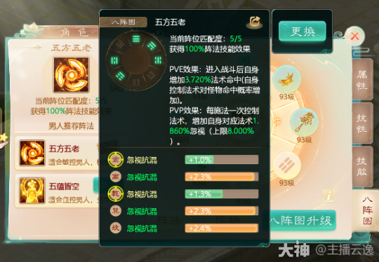 3.控制类:五方五老 由乾,震,离,巽,坎位组成。适用于人族的忽视混,冰,睡。鬼族的忽视遗忘。PVE战斗增加自身法术命中!PVP战斗每施法成功一次,增加对应法术的忽视,上限8点。阵法等级越高,每次增加的越多。越容易快速达到极限!帮你控场,赢得胜利!PVE和PVP战斗都能生效,所以任务的时候可以选择激活极限忽视的五方五老。一般由主控单位激活!