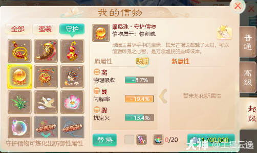 守护信物洗练属性为防御:守护信物用来洗躲闪,物理吸收,抗冰混睡忘和上限,震慑仙法鬼火三尸毒抗性。