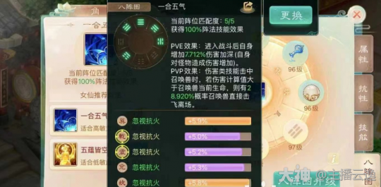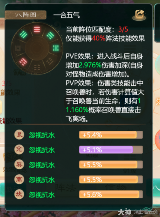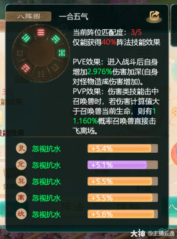 4.输出类:一合五气 由乾,震,巽,兑,坎位组成,适用于仙族的风雷水火,鬼族的鬼火,女人的毒,龙法。PVE战斗增加自身伤害加深!PVP战斗时法术击中召唤兽,若造成伤害大于召唤兽当前生命值,则有概率直接击飞离场,不会触发吉人天相,涅槃等技能!阵法等级越高概率越高!PVP和PVE战斗都可以生效!所以任务可以激活极限忽视一合五气!一般由仙族,输出龙,鬼激活!