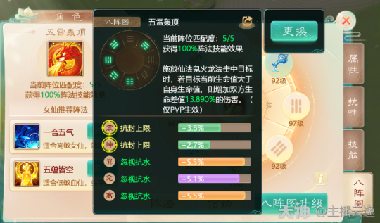 输出类:五雷轰顶 由坤,震,巽,兑,离位组成。适用于仙族的风雷水火法,鬼族的鬼火,龙法。仅PVP战斗生效!法术击中目标时,若目标当前生命值大于自身,则增加差值百分比的伤害。阵法等级越高,差值伤害越高!一般由高敏仙,输出鬼,龙族激活!