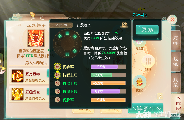 防守类:五龙捧圣 由乾,坤,巽,兑,艮位组成。这个阵法也是仅PVP战斗生效,降低敌方青面獠牙(含高级),天魔解体(含高级)伤害值,说白了就是降低敌方玄武之类的召唤兽换血的,效果也是随着八阵图整体等级会提升!也可以在帮修页面加抗青面和天魔的抗性!一般由低敏站桩针对单位激活,用来针对玄武!