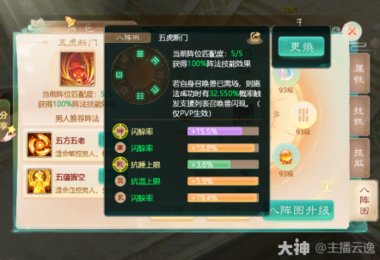 辅助类:五虎断门 由乾,坤,离,巽,艮位组成。阵法效果是施法成功有概率触发闪现,仅PVP战斗生效!八阵图等级越高,概率越高!一般由高敏治愈龙,或者敏仙激活!注意激活这个要打开闪现!