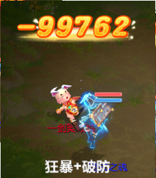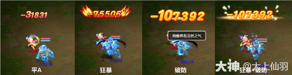注:示意图“破防”和“坡防+狂暴”伤害值一样,是因为目标单位血量太低被致命打击(空血);不考虑目标单位血量,“破防+狂暴”大于“破防”的伤害值。