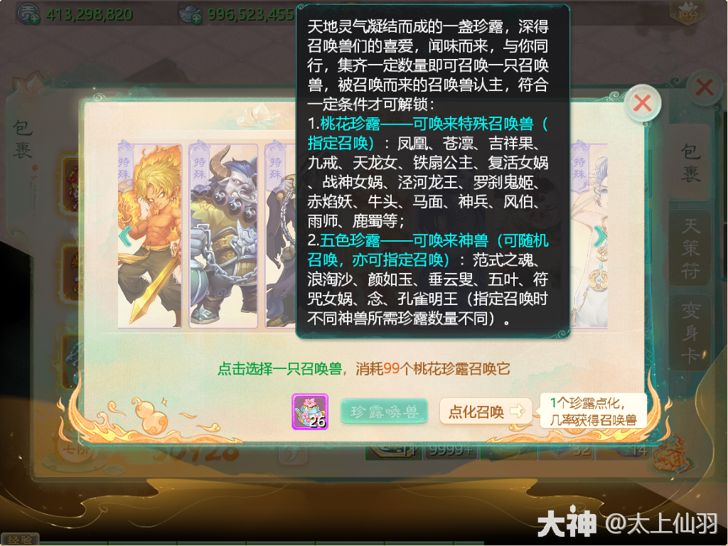 使用桃花珍露*99可以直接召唤出,这是100%获得。