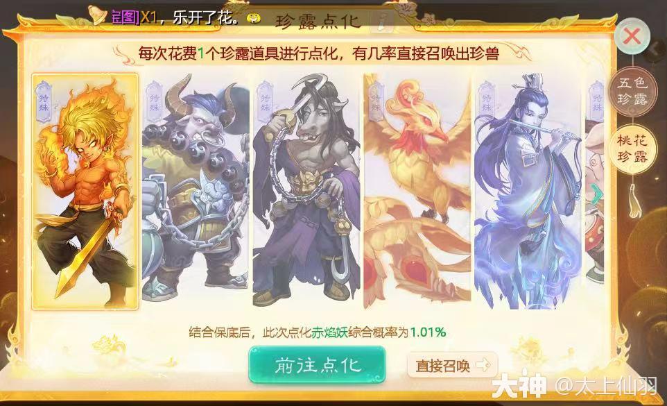 直接召唤桃花珍露*99,那么也就是说选择点化相当于(简单理解):你在用1-150个与系统博弈1-99个,从数量上看你下注后翻倍系数是0.66-99之间。