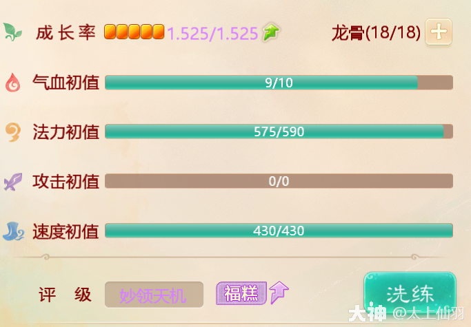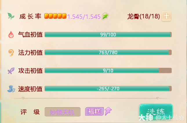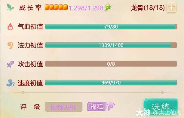 年的速度属性比重是98.336%,速度多少就决定了年能不能达到万中无一,这也就是说即便是洗练到血+攻初始值总和为3,这样的妙领天机年才有机会试用1-3个超级福糕达到速度满值。
