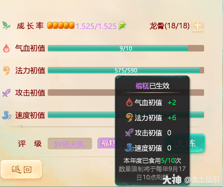 使用福糕与妙领天机瓶颈关系:满初始值-使用福糕数*5=原初始值总和下限值