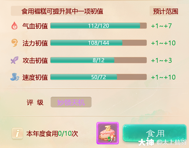 福糕作用: 提升妙领天机评级召唤兽的初值1~10点,最高至瓶颈。