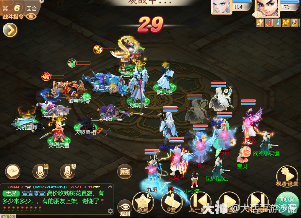 第一回合男人点阴灵卫控制,女仙秒经宝上清(头顶红色标记),龙点师宝太清输出(头顶黄色标记)