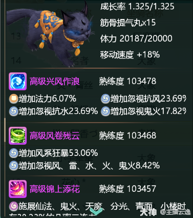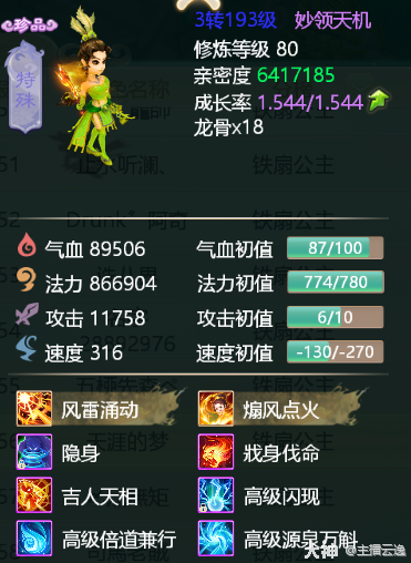 想拥有一只合格的铁扇公主,二坐骑是一定要培养的!也是自身输出的关键点所在!这里推荐高级兴风作浪*2+二连或者三连!或者高级兴风作浪+风卷残云+二连三连也可以!前者增加忽视,后者增加法术狂暴!伤害也是很客观的!