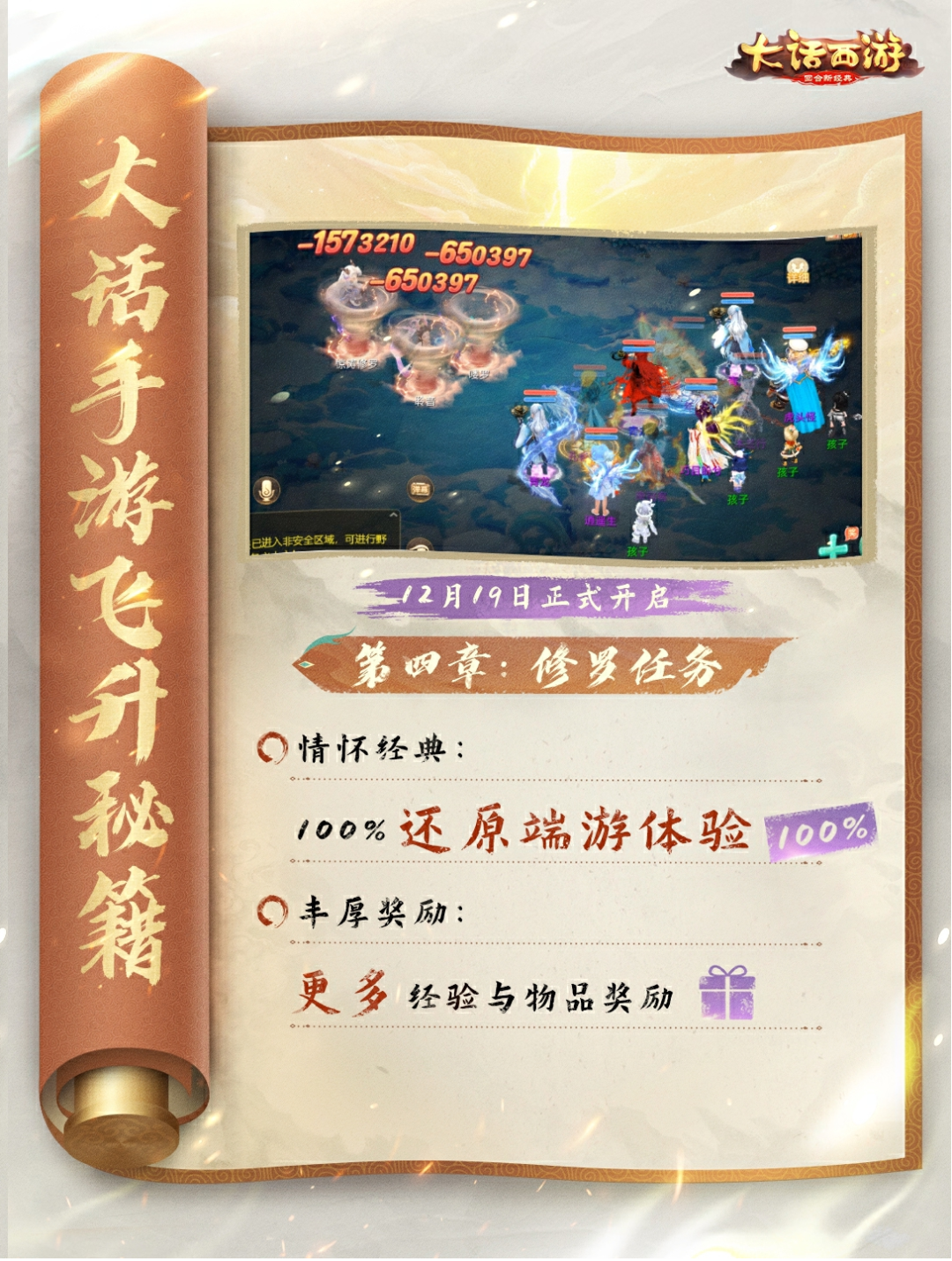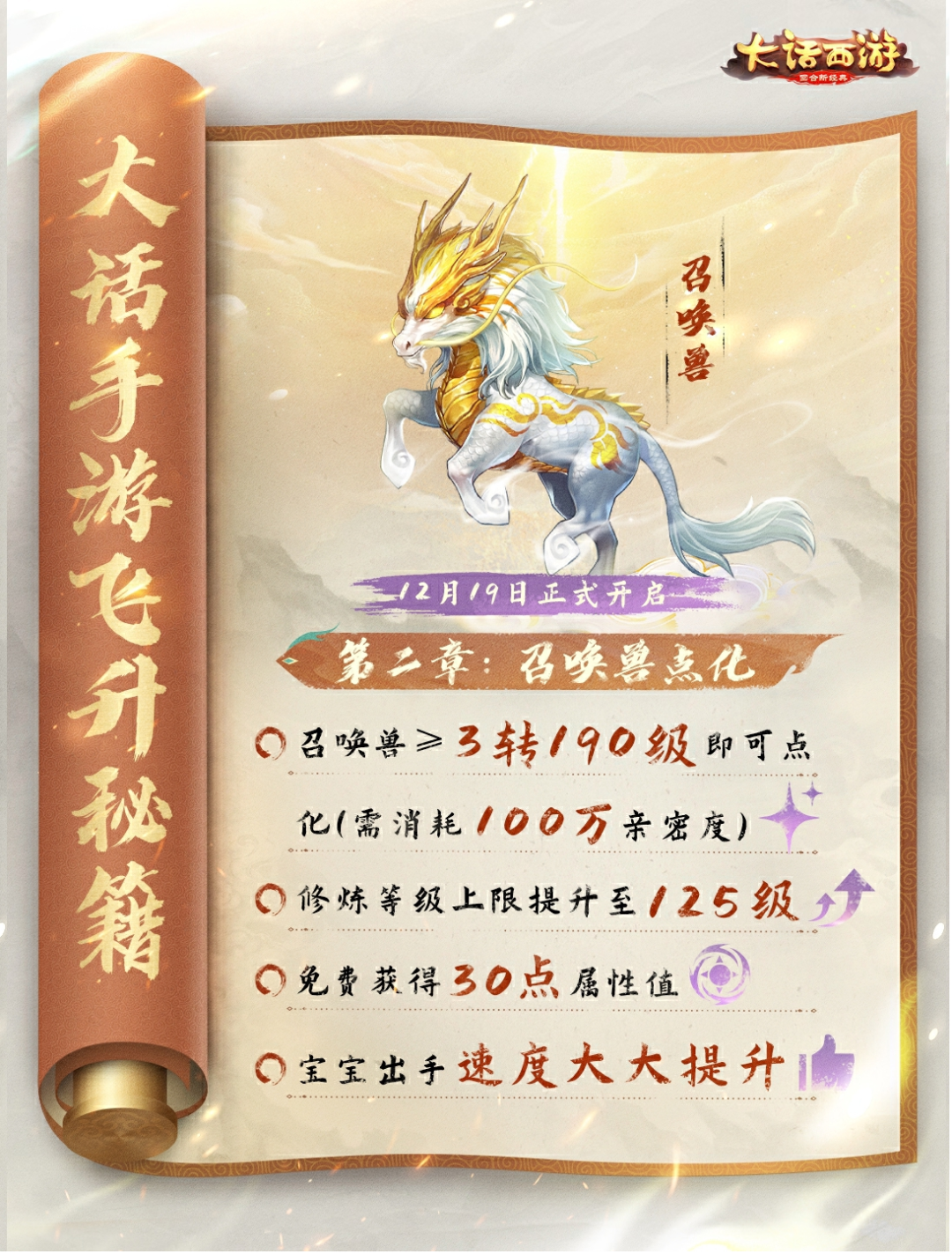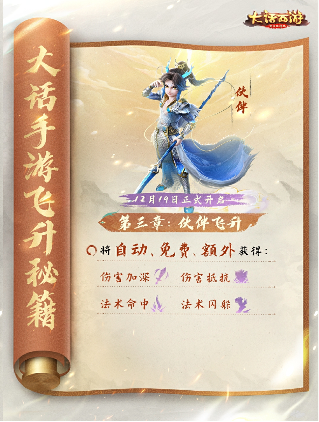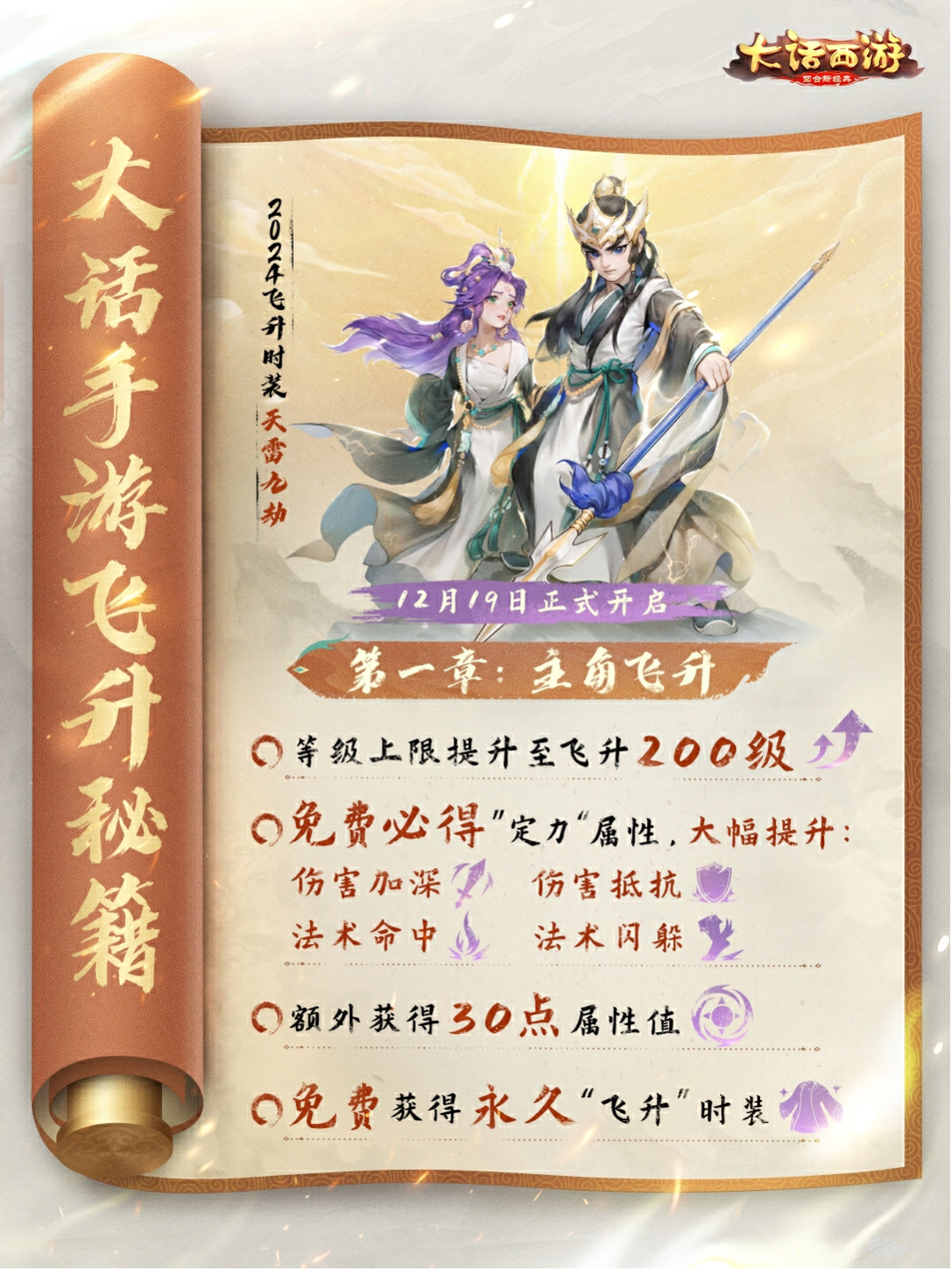 天空九道明雷闪过,敢问何方道友在此渡劫?待铁蛋我细细观察一番! 原来是咱们大话兄弟要飞升啊!有人就问了,这飞升到底有啥好玩的啊?铁蛋可听说,飞升之后,不仅能必得免费永久时装;还有全新“定力”属性,加强角色作战水平。连伙伴、召唤兽实力都将全面提升!多的不说,快看下方长图,一览飞升福利! 不瞒兄弟们说,铁蛋还求得一本飞升秘籍!详细解说了飞升之后的种种提升和不同,各位,飞升秘籍请拿好,待你们脱胎换骨,变更强! 【飞升秘籍四重奏奏响九天新乐章】 飞升秘籍一重奏·主角飞升等级上限提升至200级,全新定力属性让你拥有“飞”一般的感受!额外获得30点属性值,还有免费永久新装。(多贴心啊,知道你被雷劈了衣服得坏!) 飞升秘籍二重奏·召唤兽点化和你共行江湖的不止有兄弟,还有你的召唤兽啊!修炼等级上限提升至125级,这多的何止是一点点属性,这多的简直就是泼天的富贵啊! 飞升秘籍三重奏·伙伴飞升要飞一起飞,伙伴也不能输!你变强了伙伴也变强的,你有的提升他也有,以后的武曜台到底是谁家天下还犹未可知! 飞升秘籍四重奏·修罗任务端游经典玩法相信不少朋友已经眼馋了很久,别馋了,轮到你去伸张正义了! 飞升系统12月19日正式全服上线,多重惊喜玩法等你前去体验,全面提升实力,飞完换套新装,迎来江湖全新模样,铁蛋等着兄弟们,一起飞起来! 更多游戏攻略,请锁定叶子猪《大话西游手游》官方合作专区。 [编辑:叶子猪小秘书]