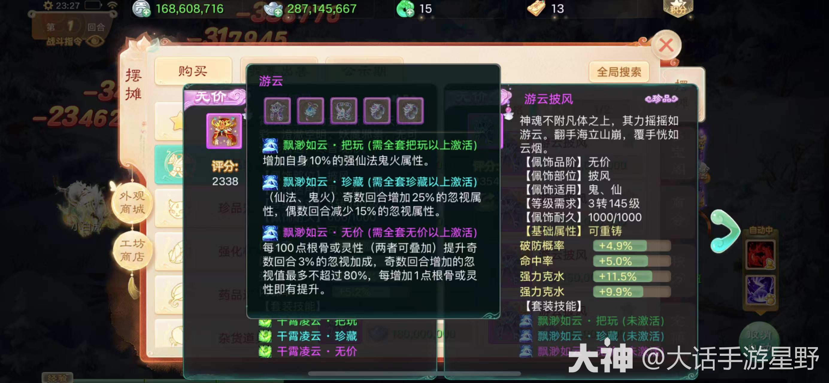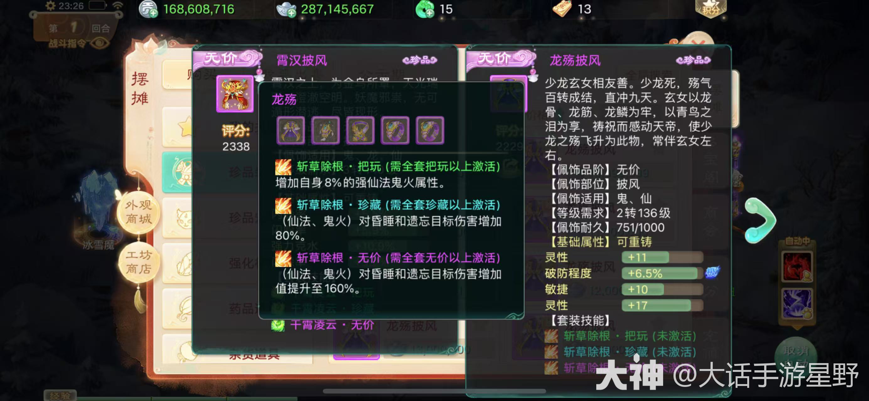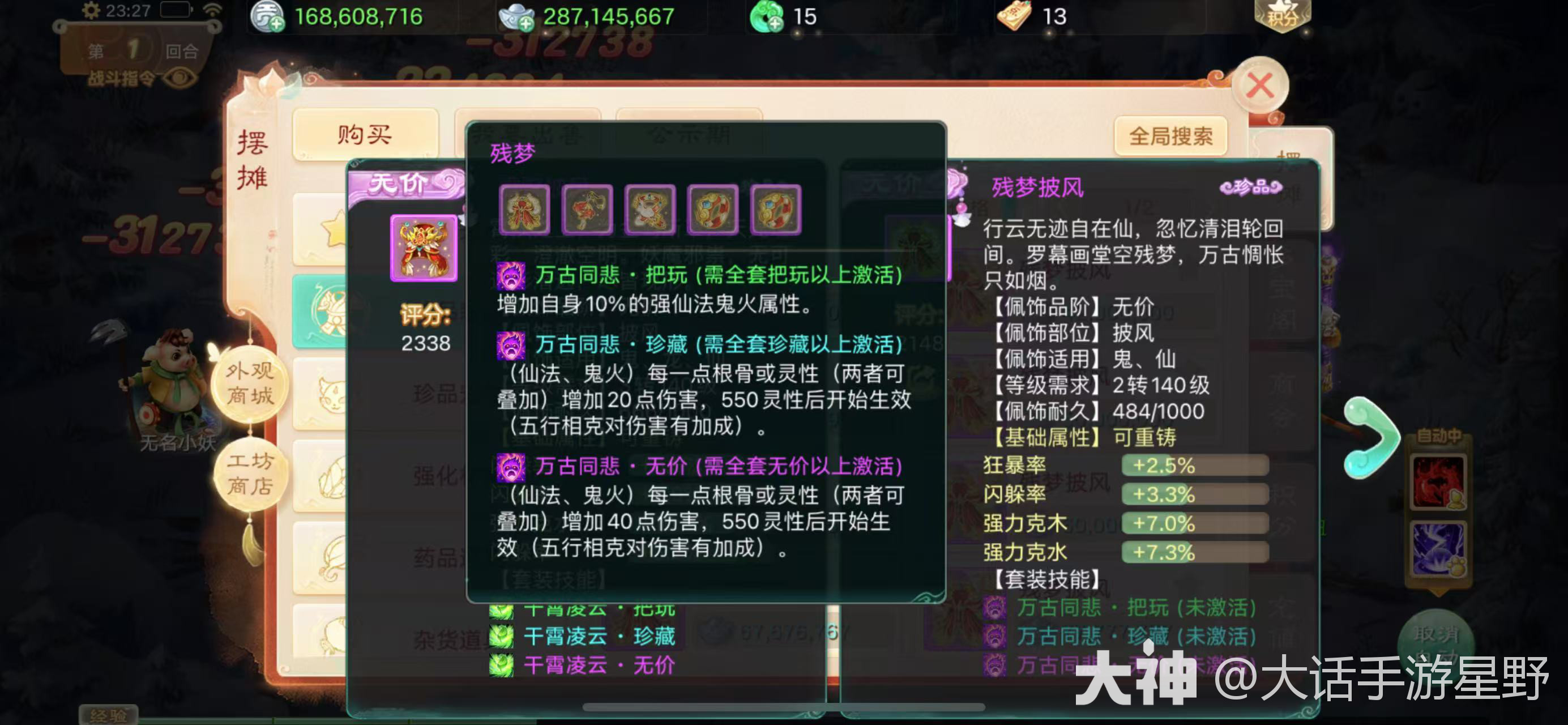 无价效果:每100点根骨或者灵性提升奇数回合3%的忽视加成,奇数回合增加的忽视最多不超过80%,简单来说:就是奇数回合比如1、3、5这样的回合伤害高,偶回合伤害减少,百万炮的首选,但是价格略贵
