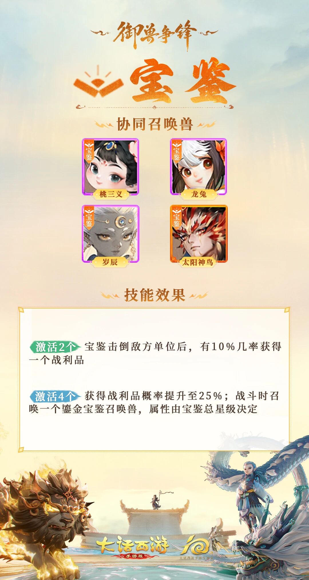 大话手游2025年度玩法资料片《御兽争锋》,抢先体验火热进行中(首轮开放服务器情系今生、神裔觉醒、卧虎藏龙、相聚长安、与歌同行、风生水起),12月18日(下周四)正式上线! 这是大话全新的策略竞技玩法,对局匹配八位少侠,通过玩法内养成、召唤兽阵容搭配。御兽对弈,胜者为王! 全新玩法上线,攻略必须到位。上一期,铁蛋已经为大家整理了《御兽争锋》核心玩法解读。 >>三只相同的召唤兽可合成升阶?新玩法御兽争锋,召唤兽的几率竞技! 本期铁蛋将带来更详尽的官方独家情报,全面盘点新玩法御兽争锋的【召唤兽羁绊】设定,助你解锁阵容搭配的隐藏密码! 话不多说,干货情报图奉上—— 战斗类型羁绊 阴阳五行羁绊 万能羁绊 铁蛋暖心总结: 召唤兽羁绊是《御兽争锋》玩法的核心策略支点,不同类型的羁绊各有妙用:战斗类型羁绊直击对局攻防痛点,阴阳五行羁绊暗藏属性克制玄机,更有特殊效果羁绊触发扭转战局的惊喜特效。如: 女娲羁绊,逆风翻盘好手,就算对局失利也能保留发育资源。局面越劣势,战败获战利品概率及战斗加成属性越高。大幅降低试错和战败的资源损失,适合偏运营、愿意主动尝试阵容博弈的玩法思路。 宝鉴羁绊,凑齐四个单位后,击倒敌方获得战利品的概率提升至25%,进一步强化资源获取效率;同时,对战过程会召唤出额外的鎏金宝鉴召唤兽参战,其属性由宝鉴总阶级决定,阶级越高召唤兽战力越强,相当于额外增加一个战斗单位,提升阵容的输出和承伤能力。 四圣羁绊,凑齐四个单位后,战斗可召唤古神助战(古神属性由四象总阶级决定),对局建立人数和战力优势,不管是抢节奏压制敌方,还是靠古神承伤保护己方核心召唤兽,都能发挥关键作用。 万能羁绊,可从出场数量最多的三种羁绊里选一种提升召唤兽数量,是阵容搭配的“灵活手”。能针对性补强核心羁绊的召唤兽规模,快速凑出高阶羁绊效果,让阵容成型速度和适配性大幅提升。 少侠们只需吃透这些羁绊设定,结合上阵区、支援区的双重布阵机制,就能打破单纯的数值比拼,打造出1+1>2的强力阵容,在八人对弈中轻松脱颖而出,问鼎御兽之巅! [编辑:ssc]