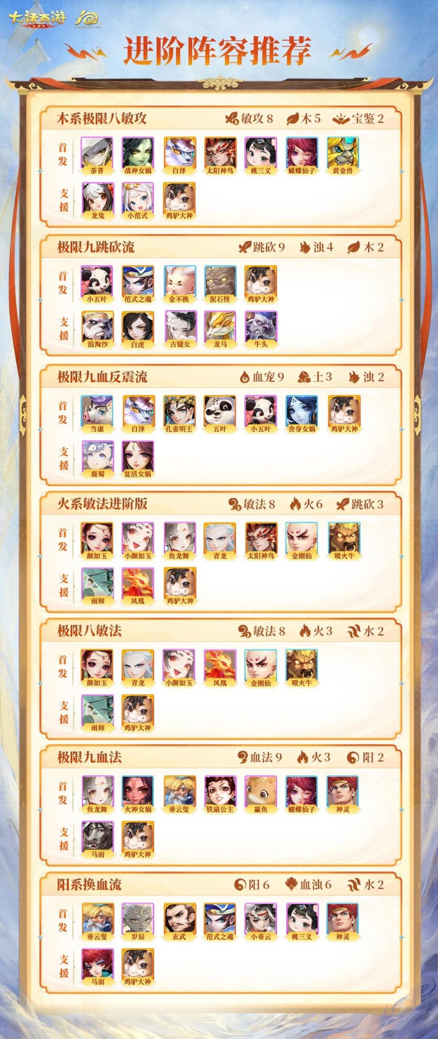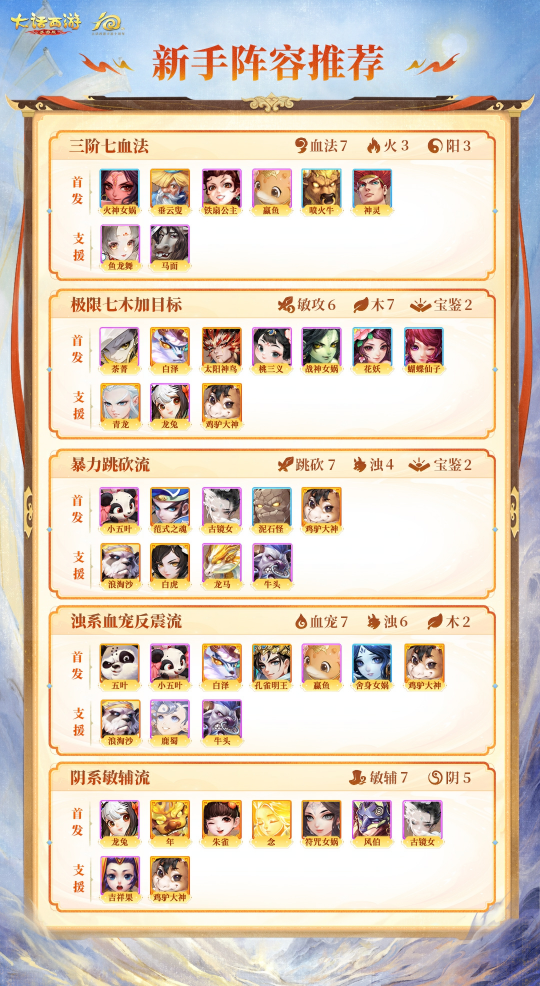 大话手游在御兽争锋玩法里,阵容选择是左右对战胜负的核心关键。本期攻略将聚焦御兽争锋的阵容体系,为各位少侠奉上超实用的实战搭配技巧。 新手阵容:易成型、稳发育的入门选择 新手阶段的核心需求是阵容易获取、对战容错率高,官方推荐的五套新手阵容覆盖不同战斗风格,可根据自身召唤兽池灵活选择: 1、三阶七血法:以火神女娲、垂云叟为核心的血法体系,兼具输出与续航,火、阳属性加成提升法系伤害,新手期的通用选择。 2、极限七木加目标:木系敏攻阵容,依靠桃三义、太阳神鸟等召唤兽的多目标攻击快速清场,宝鉴属性加持增加战利品获得概率,对局越胜越强。 3、暴力跳砍流:跳砍属性为核心的物理爆发阵容,浪淘沙作为核心输出点。凑7跳砍羁绊提高闪现概率及破防程度,浊羁绊伤害加深。对敌伤害拉满,刀刀暴击! 4、浊系血宠反震流:以五叶、白泽等血宠为核心,借助反震效果消耗敌方,浊、木属性强化生存能力,适合打持久战的防守型玩法。 5、阴系敏辅流:以年、朱雀为核心的敏辅体系,阴属性加成提升辅助效果,依靠速度优势控场、加buff,搭配符咒女娲等召唤兽进一步强化团队功能性。 进阶阵容:高上限、强适配的攻坚搭配 进阶阵容更注重属性联动与战术组合,针对高难度对战与竞技场景设计,需结合召唤兽养成深度搭配。如: 1、木系极限八敏攻:木、敏攻双属性的多目标爆发阵容,茶菁、战神女娲为核心输出,搭配龙兔、小范式等支援召唤兽,最大化敏攻体系的压制力,适合快速终结对战。 2、极限九跳砍流:凑齐9跳砍羁绊,对阵时跳砍闪现和召唤进场会额外出现一只相同召唤兽,且拥有125%基础属性。再叠加4浊羁绊的伤害加深,阵容强度再提升! 此外,还有极限九血反震流、火系敏法进阶版、极限八敏法、极限九血法、阳系换血流等进阶内容推荐,具体召唤兽配置可看下图~ 铁蛋暖心总结 1、看阶段选阵容:新手优先选择召唤兽易获取的血法、敏攻基础阵容;进阶玩家可根据自身养成的召唤兽池,搭配属性拉满的专精阵容。 2、看对手调阵容:面对爆发型对手,选用血宠反震流等防守阵容;面对续航型对手,选用敏攻、敏法阵容快速破局。 3、属性联动优先:阵容搭配需贴合敏攻、跳砍、血法等核心属性标签,属性层数越高,阵容效果越显著。 温馨提示,游戏内还有更多阵容推荐选择,少侠们可以自行进游戏内查阅更多哦~ [编辑:ssc]