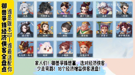 大话手游御兽争锋侠客怎么选?谁是版本T0经济增益型侠客?御兽想要吃鸡,选对经济侠客很重要,今天带来16个经济增益侠客盘点。 首先肯定是财神,能够刷新跟增加召唤兽伤害,后期是非常猛的,嫦娥则是不买召唤兽,则额外获得2牙币,空城流专属侠客。 春十三娘是40牙币大地提利息到8,高玩滚雪球必备,大内高手每击败5个敌方召唤兽,就可以获得2牙币(可跨阶段)。 二郎神作为首个四级召唤兽,可直接升至2阶,后期冲上限必备,丐帮帮主输了得2个牙币,苟分吃低保可以用这个,有效应对后期乏力。 更多经济性侠客推荐,大家可以看上面这张盘点图片,如果有其他不同想法,欢迎评论区留言。 [编辑:ssc]