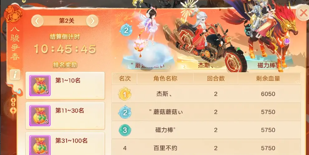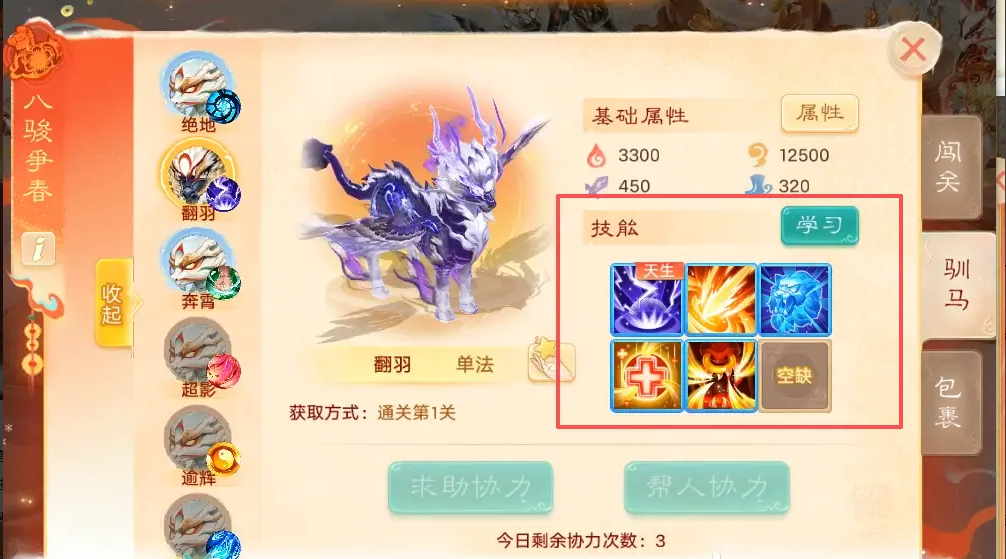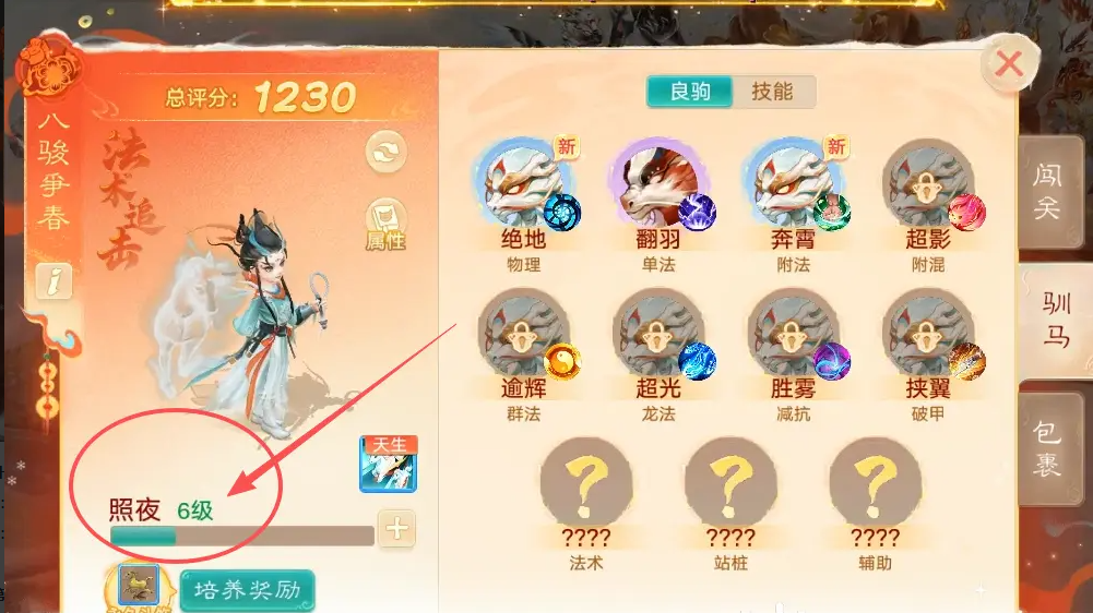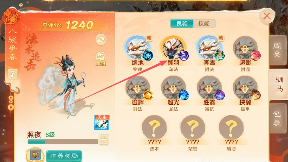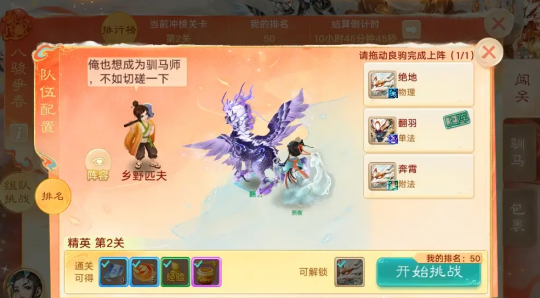 大话西游手游八骏争春,类似去年李逍遥活动的玩法,通过搭配不同驯马和技能,挑战关卡。本期文章咱们来说精英2如何通关并且上榜! 第一步:先把照夜升级到6级 升级方式: 1:打怪(这一步很简单) 2:活跃度领取 第二步:合成技能 1、打怪会获得15个普通技能碎片,可以随机合成三本普通技能, 2、也可以通过郭老板兑换5个碎片,再随机合成一本 第三步:选驯马选 推荐用【翻羽】,也就是第二个释放单法的。 第四步:装备技能 给翻羽马,把技能都装备上。 第五步:进入战斗 进入战斗后,可以优先集火乡野匹夫,因为他会回拉血。 2回合内打死怪物,就可以上榜了。如果2回合内打不死,可以多刷几次,刷照夜暴击,基本就2回合带走了。 不同排名会几率各种物资和奖励,大家赶紧去试试吧! [编辑:ssc]