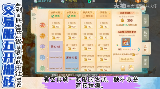 大话西游手游交易服五开搬砖,每日任务照抄这个就行了,五环、宝图任务,每天必做,200环每周一次,收益稳得很,副本、天庭或抓鬼,组队挂机就能搞定,轻松不费脑。 地煞星直接用唤星符,省心又高效,没有唤星符的话,就整点蹲一个星就行了,大理寺答题不用想,全选A别问为什么,省时省力反正没错的! 周末任务必做,鸡驴大神会突然来袭,有空再刷一波限时活动,额外收益直接拉满了,重点记住每天打满150点活跃度,奖励真是拿到手软,攒珠贝还能换蜃楼瑰宝。 [编辑:ssc]