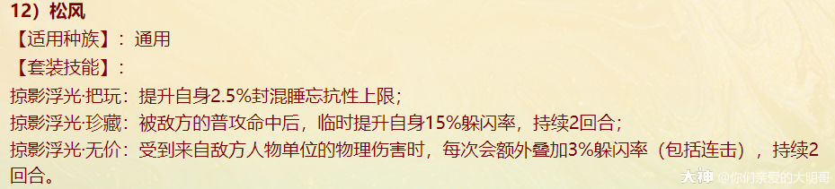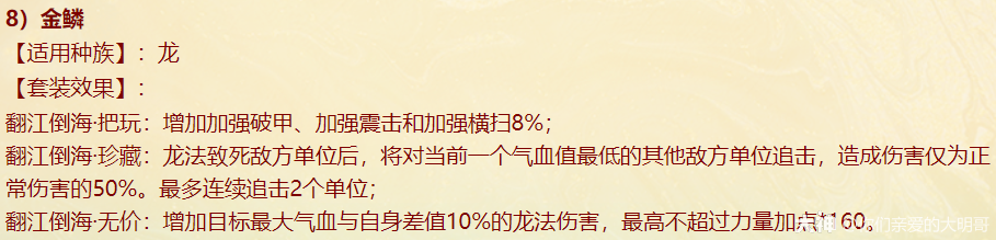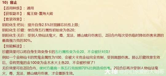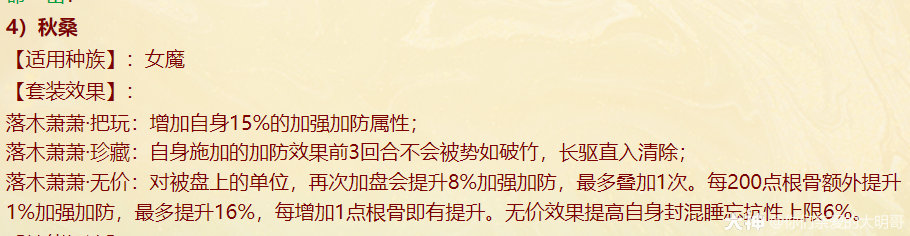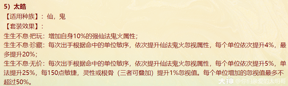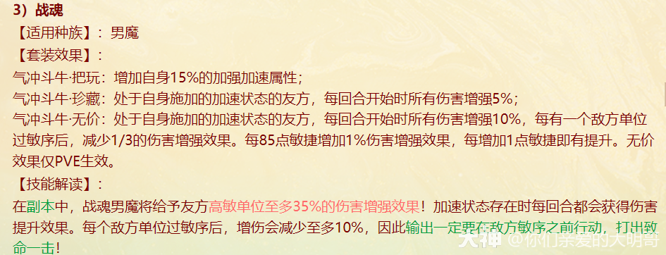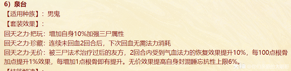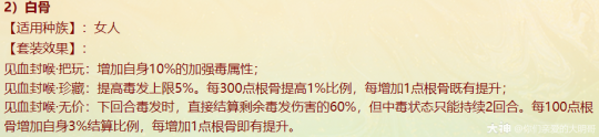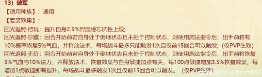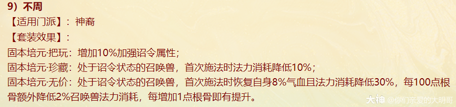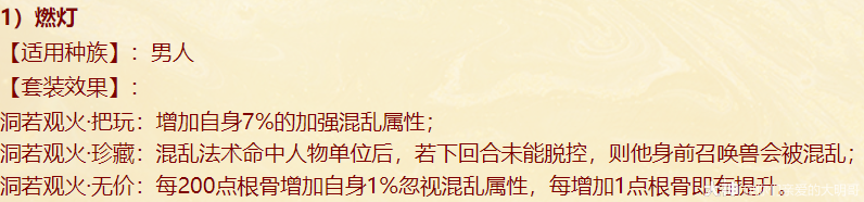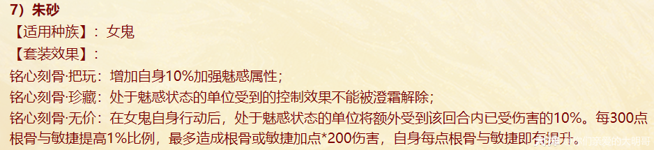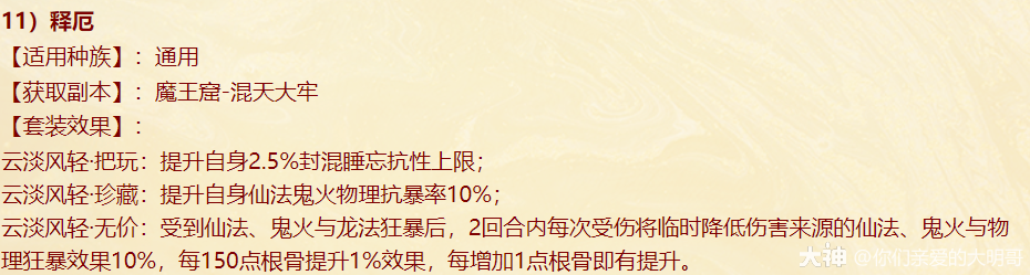 本周四维护过后,新资料片《一念圣魔》就开始局测,新配饰上线、老配饰重做,很多玩家看不明白,大明也是通过自己的理解和咨询给大家浅浅的解读一番,有不对之处还忘指出改正。 燃灯(混男人) 大明解读: 被控角色下回合初没有脱混,不论是之前有的还是神裔帮忙叫的,都会100%被混。 青梅竹马是读秒结束后再解控,召唤兽不会被解优先级低。不过对于敏队来说,高敏人物一个当头、高敏召唤兽春回能破解。 无咎相对来偏任务(无价效果pk不生效),但可以完美替代罗睺。 白骨(毒女人) 大明解读: 【中毒状态仅能持续两回合】包含上毒的本回合,次回合毒发为第2回合,也就是说女人得每回合都上毒,才可以保证一直毒发!超过50%的毒发,独一档的存在,根骨属性超过1333点,会突破100%。 举例女人根骨1500点,假如第2回合正常毒发10万,携带无价白骨那么第二回合毒发=10万+10*1.05(第三回合的毒发)+10*1.05(第四回合的毒发)=31万。如果第二回不继续挂毒,第三回合就没有毒的状态了。 白骨跟改版后相柳(减毒抗)对比,毒发回合减少但伤害更足!不过,对手如果针对高抗毒,相柳还是非常适配的。 战魂(敏男魔) 大明解读: 无价效果仅在任务中生效,珍藏效果PK会生效。 一次起速=强速+戮仙强伤效果,回合越多,增伤越明显。 装备无价套装时如果对面比己方输出快,会每次削减1/3,最多减少增伤的10%。例如一个1500敏的男魔速上后立刻增加10%+1500/85=27.65%的伤害,对面敏序插入进来,增伤不会少于17.65%。 如果对面敏序在男魔之上,男魔无论什么在回合中的任何时候加速,增伤效果都会消失,只有敏队男魔搭配敏输出适配。(问的策划,我也不知道原因,具体还要实测) 秋桑(盘女魔) 大明解读: 防大小破竹这点,以后高端PK女魔可以上桌了!并且无价效果增加抗控制上限6%(比新雅声高1%)。 另外再次上盘,会叠加强防的效果。比如女魔6回合盘上,6.7.8三回合不会被破,在第8回合再上盘,8.9.10三回合依旧不会被破。 但白虎技能、大画换状态是可以摘除的。 按纯根骨女魔来算,无价叠加盘轻松+30%加防,再装备自带,强防属性轻松过130%,再加上25500熟练度含情脉脉(大盘),能提供17.6%的额外抗控制上限和98%的仙法鬼火毒物理等抗性。 太皓(仙鬼输出) 大明解读: 根据敏序递增法术忽视,被秒的单位速度越慢,受到的法术忽视就越高,最多递增5个,孩子叫6不继续叠加。 按照敏炮,根骨+灵性+敏捷=1950来算,额外提升13点忽视,第一个敏序目标5+13(按最多10点忽视来算),第二个10+13(按最多20点忽视来算),第五个25+13。对比游云纯敏状态下,400灵+200根骨,单数回合忽视提升3*6+25=43忽视,双数回合减少忽视15点。纯血情况下,游云几乎能提升80%忽视。 总的来说,太皓非常适合敏队输出,伤害稳定且能对低敏单位造成大额伤害。太皓单法溅射时,按照第三个单位来计算忽视。 泉台(回血男鬼) 大明解读: 珍藏效果,开刀也好,召唤拉血被控也好,普攻也好不论如何,只要两次没有出手回血,第三次出手的时候(不能被控或化无),一定不消耗蓝量的,空蓝、步履维艰、加强悬刃也能出手回血。 无价效果,回血时会给队友加一个buff,当前和下回合有其他回复效果(三尸虫、拉药、大小绝、遗产)会提升治疗效果。而且提高自身封混睡忘抗性上限6%,加强了被控能力。 朱砂(魅惑女鬼) 大明解读: 珍藏魅惑被控后,不能使用澄霜解(包括风伯),但其他银魄、大小春回、大画换、成仁如沐等是可以解除的。 无价效果,在没有魅惑情况下抽秒后,女鬼再挂魅惑会立即引爆!(当前回合直接爆)按根骨+敏捷1500点引爆伤害能打出最多15%的伤害(真实伤害?五蕴、承天、伤害抵抗会不会抵挡?还需要测试),但总的不超过30万伤害,如果对面绝境这那的等等拉起,抽秒青龙伤害都算在内。 对比无价秋水,按照1000点敏捷算,每回合初扣除对面15%的血量,会比朱砂伤害来的更多但不会致死;朱砂是回合内增加伤害,任务中也会生效。两者效果不同,平分秋色吧。 金鳞(输出龙) 大明解读: 效果类似与人物版本的分花拂柳,最多追两次。会有可能飞7+陌上+追击*2=一下就清屏!但目前不知道和陌上、孩子技能回手掏、飞花是否共存。 另外无价效果可以增加气血差值伤害,如按1400力量计算,就会有至多15.6万伤害的增加(狂暴得实测) 可以说,金鳞(珍藏足够)套装将会是龙族任务的标配,PK还是要上命中霄汉的。 不周(神族诏令) 大明解读: 套装目前看来新引力不足,减少耗蓝量只有在步履维艰的情况下适用, 无价效果回复8%的气血,假如召唤兽在被打出吉人的情况下,8%的回复量不足以应对双管和加强悬刃,而且在诏令状态下,只有一次回复或减少耗蓝机会,作用不大。 容止(通用配饰,覆海大殿及之后魔王窟产出) 大明解读: 提升抗控制上限2.5,珍藏效果强行拉齐五行各20点,防止因吃属性卡导致的五行相克。 无价效果,挨揍后两回合内会降低所有对手的五行克效果70%,例如100的金刚仙卡,会折算成70金;80木的青龙卡,会折算成56木。 和召唤兽提克有直接影响,假如对手召唤兽提强力克金200%,在命中容止单位结算伤害时,按照140%强力克金结算。第三回合重置,再挨揍一次,再次激活容止无价效果。 释厄(通用配饰,混天大牢及之后魔王窟产出) 大明解读: 提升抗控制上限2.5,珍藏效果提升自身仙法鬼火物理抗暴率10%,并不是大家认为的减少狂暴概率,而是减少狂暴增伤。仙法狂暴效果为非狂暴状态1.5倍,物理狂暴