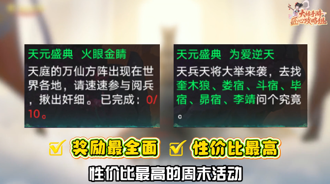 大话西游手游周末必做任务,周末为什么一定要上线?因为天元盛典奖励最全面、最丰富,经验稀有道具培养材料一键打包带走,省时又省力,何乐而不为? 天元盛典从挂机到挑战全都有,不做等于血亏,火眼金睛是纯纯的福利关卡,你只需要在方寸山、白骨山等几个地点找到NPC,组队后点击就能自动刷完任务。 10次全程挂机,轻松拿到人物经验一级神兵和见闻录,接下来是核心挑战为爱逆天,需要组队击败5个BOSS,难度从60级到120级逐步提升。 怪物控制技能很强,所以队伍里有个可靠的人族控制非常重要,最后打难度挑战,李靖分为普通和简单难度来打,这里的关键是必须优先控制会加血的天龙女和武曲星君。 同时我们也要注意会解控的李靖和铁扇公主,只要控制链不断就能通关,获得聚魄丹、龙之骨和神兵等顶级奖励。 最后是单人任务思凡,在长安城月老那里接任务,然后跟着指引和NPC对话,最后轻松击败千里眼就能获得丰厚奖励了。 [编辑:ssc]