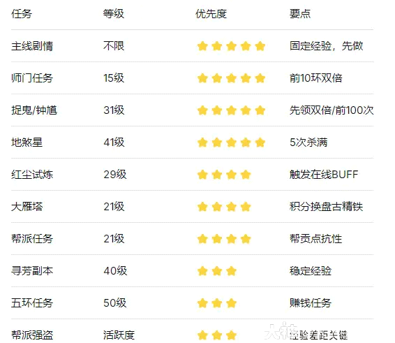 核心原则:剧情任务第一位,单人补空凑级,副本到了就去,钟馗捉鬼最后刷。