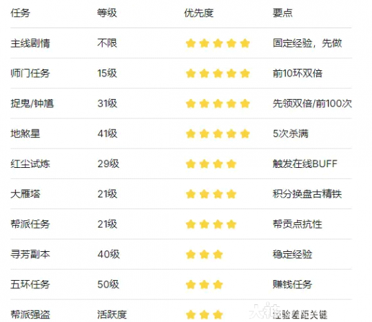 红尘试炼(29级触发):必须在29级完成,能获得在线经验BUFF,每30分钟额外奖励一次经验,冲榜必备。