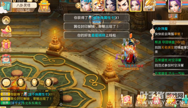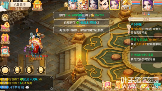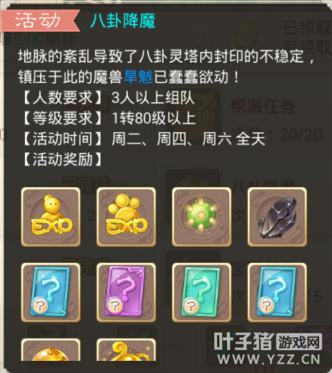 今天花花给大家分享一下八卦降魔,新资料片上线以来今天是第2次做八卦降魔的任务,为了让大家更清楚的看到看懂其中的玩法,所以花花也是将整个过程记录了下来,那么下面就让我们一起来看看吧! 每周二四六全天开放,1转80级以上玩家可参与。 除了可以获得经验还有变身卡,属性卡已经物品奖励和五行珠奖励。 看完视频后我们来总结下! 队伍配置:基本和杀星寻芳差不多,出入不是很大,所以小伙伴们不需要太多的担心! 每击杀一个位置的小怪,主怪就会慢慢苏醒!当然了前面的小怪是很好杀的! 获得经验和五行珠! 越到后面小怪的威力也会增加,例如这几只小怪的物攻就非常的高! 直到最后一只怪,即将呼唤主怪! 建议混杀,男人直接混主,如果装备略差的玩家可以选择冰杀! 那么需要注意的除了要控制好主怪意外,还要控制好龟丞相和铃仙(紫霞仙子)因为龟丞相会混,铃仙会三尸虫,吧这2个小怪控制了基本全场无疑了! 最后就是丰厚的经验和物品奖励了,然后拿着五行珠摆摊出售或是自己修炼五行都很不错哦! 一周只有三次要抓住机会不可不做哦! 小编点评: 丰厚的任务奖励,同时活动难度不大,对于冲级的玩家来说无疑是一个很好的练级途径,而且丰厚的物品奖励也给平民玩家一个发家致富的机会,五行珠也能提高自身属性,拉近与土豪玩家的差距,所以说这是一个每周必做的活动,千万不要错过哦! ▌关于游戏: 大话西游同名手游在玩法上继承了端游的经典玩法。诸如婚姻、家园、庭院、结义、PK、帮战、联赛、皇宫、五环、杀星、挖宝、做天、修罗、地宫、杀塔等大话2玩家所熟知的要素都将在针对智能手机特性优化后加入。而最受大话2玩家喜爱的情义社交体系,如帮派、结义、师徒婚姻系统等也将移植到手游版上。 2015,大话西游同名手游,话回青春,不见不散。 2015,大话西游同名手游,让我们静待这一次的青春到来。 大话西游手游官网:http://xy2.yzz.cn/sy/ 大话西游手游下载:http://www.yzz.cn/ku/dhxy/ 【叶子猪手游通大话手游QQ交流群】 叶子猪为广大玩家提供最活跃的QQ交流社区,在这里你可以畅所欲言,交流心得体会等,Q群更是会不定期内举办活动,越活跃得奖励的机会越大哦。 群号:213794076 [编辑:AP]