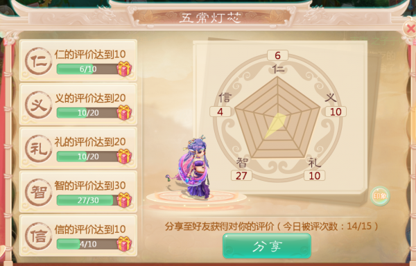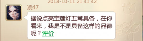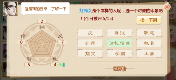 4、每次积累到十点数值可以兑换一个对应灯芯 5、评价好友的时候会随机出现九种标签(换一次词20W银两)