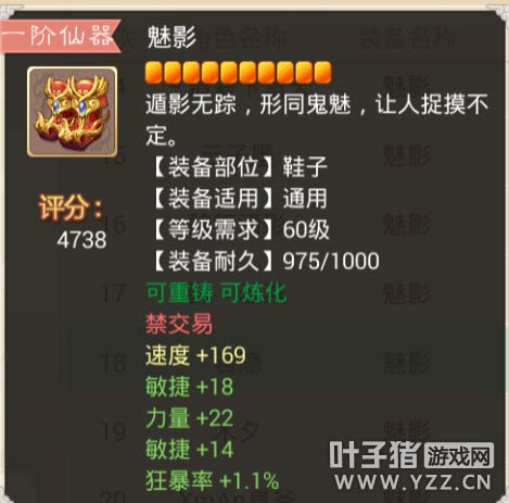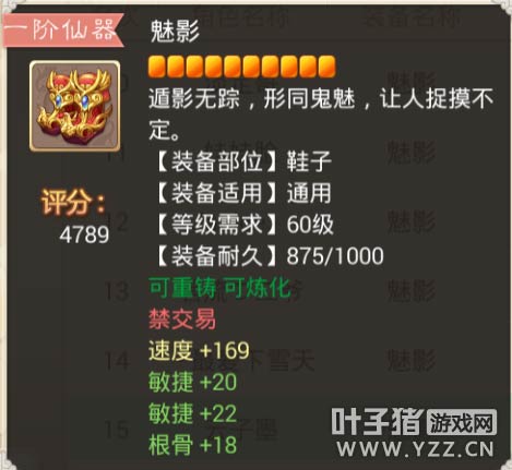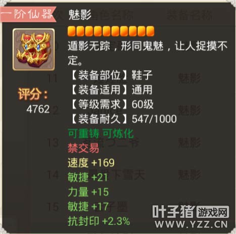 【本心得原创于叶子猪论坛,作者:三围吓死你 ,转载请注明来源】 大话西游手游中,仙器作为装备中的NO1首选的确是实至名归,强大的属性,华丽的外观,可以说是每个玩家都在追求的装备之一!今天给大家带来关于大话手游装备高分排行榜之鞋子篇①! 那么仙器的属性和炼化都会影响到装备的评价评分~那么什么样的装备的评分会更高呢? 下面就让花花带大家一起去看看,高评分的那些装备以及那些属性! 更多相关攻略 ▌关于游戏: 大话西游同名手游在玩法上继承了端游的经典玩法。诸如婚姻、家园、庭院、结义、PK、帮战、联赛、皇宫、五环、杀星、挖宝、做天、修罗、地宫、杀塔等大话2玩家所熟知的要素都将在针对智能手机特性优化后加入。而最受大话2玩家喜爱的情义社交体系,如帮派、结义、师徒婚姻系统等也将移植到手游版上。 2015,大话西游同名手游,话回青春,不见不散。 2015,大话西游同名手游,让我们静待这一次的青春到来。 大话西游手游官网:http://xy2.yzz.cn/sy/ 大话西游手游安卓APK下载地址:http://downtool.yzz.cn/php/dlapp.php?id=5 大话西游手游模拟器版下载地址:http://flv.969g.com/antplayer/antinst_dhxy.exe [编辑:AP]