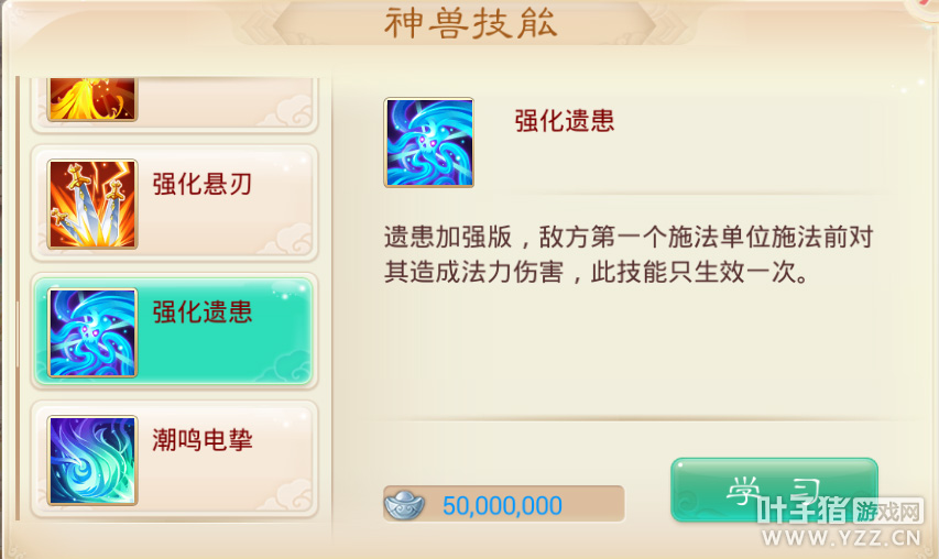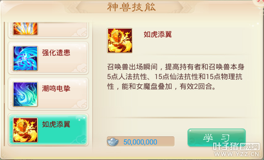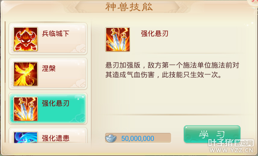 【本心得原创于叶子猪论坛,作者:三围吓死你,转载请注明来源】 无论大话西游手游还是梦幻手游的玩家,神兽一直都是每个玩家所追求的,而作为神兽不但要有这出色的初值和外表,更重要的是它的专属技能,下面花花为大家带来关于大话西游手游神兽技能属性一览。 首先第一个兵临城下,攻击力提高2.5倍,是攻宠必备的技能。相信大家都有看到过一些范式之魂,浪淘沙之类的都会携带此技能,一刀就可砍死男鬼哦!!! 神兽技能-涅槃,这个技能有点像梦幻中的高级神佑复生哦!!30%几率全血复活,血宠推荐携带。 强化悬刃,对敌方第一个施法单位施法前对其造成气血伤害,一般神兽颜如玉会选这个技能! 强化遗患,和强化悬刃一样,对敌方第一个施法单位前对其造成法力伤害,吸蓝专用。一个非常不错的技能哦!!! 潮鸣电掣,是倍道兼行技能的加强版,能够增加召唤兽的速度,绝对是敏系必备~年的专属!!! 最后如虎添翼,提高人物和召唤兽的抗性,适合血法宝宝~还可以与女魔的盘叠加哦!!!是个不错的技能。 当然,这些神兽技能学一下需要花费5000W银子,而且小编根据市场高级技能书对比了一下,还不是很贵,还是可以接受的~ 但前提是,咱们必须得有神兽在身啊!没有神兽,有再多的神兽技能书也是没用。更有网友说:“你若有神兽,便是土豪的节奏。” 花花也会和其他玩家一样盼望着游戏会退出更多的活动,能够送神兽,这样花花就可以搞一只了。 当然如果你对大话手游神兽有想法,不妨先来了解一下:《大话西游手游》神兽图鉴一览全 ▌关于游戏: 大话西游同名手游在玩法上继承了端游的经典玩法。诸如婚姻、家园、庭院、结义、PK、帮战、联赛、皇宫、五环、杀星、挖宝、做天、修罗、地宫、杀塔等大话2玩家所熟知的要素都将在针对智能手机特性优化后加入。而最受大话2玩家喜爱的情义社交体系,如帮派、结义、师徒婚姻系统等也将移植到手游版上。 2015,大话西游同名手游,话回青春,不见不散。 2015,大话西游同名手游,让我们静待这一次的青春到来。 大话西游手游官网:http://xy2.yzz.cn/sy/ 大话西游手游下载:http://www.yzz.cn/ku/dhxy/ 【叶子猪手游通大话手游QQ交流群】 叶子猪为广大玩家提供最活跃的QQ交流社区,在这里你可以畅所欲言,交流心得体会等,Q群更是会不定期内举办活动,越活跃得奖励的机会越大哦。 群号:213794076 [编辑:Dickson]