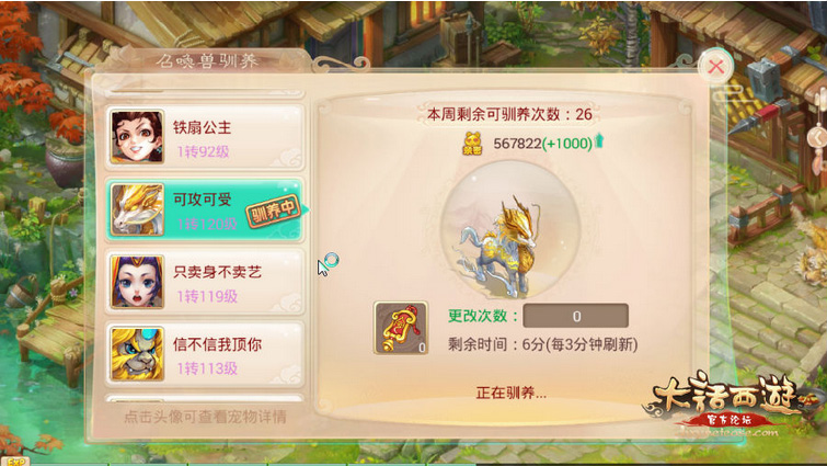 1.对驯兽老翁对话后会打开驯养界面,选中召唤兽并开始,会扣除包裹里的相应的驯养令,每次消耗1个,每个驯养令耗时1小时