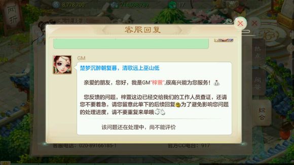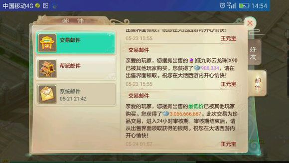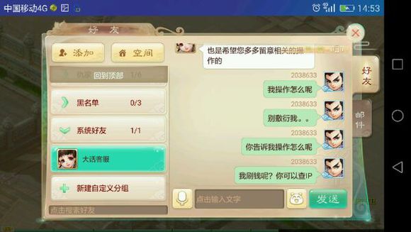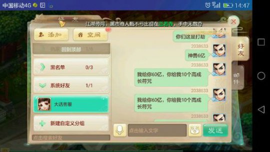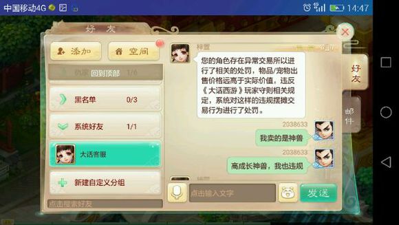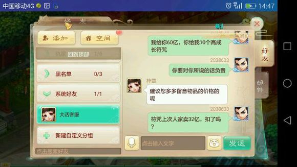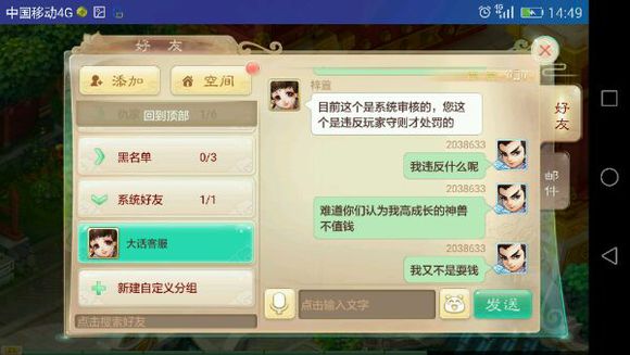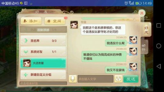 大家看吧! 这几天不是合服了吗?手里有个符咒就想卖掉,于是在合服当天喊呀喊! 但是,客服的回答态度让我越来气愤,他们难道想告诉我你就认了吧?我违规操作呢? 难道官方对神兽的定价为6.9亿 继续和GM理论。。。 我就告诉他们,如果我刷钱,你们可以查IP呀。。。 GM敷衍了事的回应了一下,就失去联系。 还是没有结果 ▌关于游戏: 大话西游同名手游在玩法上继承了端游的经典玩法。诸如婚姻、家园、庭院、结义、PK、帮战、联赛、皇宫、五环、杀星、挖宝、做天、修罗、地宫、杀塔等大话2玩家所熟知的要素都将在针对智能手机特性优化后加入。而最受大话2玩家喜爱的情义社交体系,如帮派、结义、师徒婚姻系统等也将移植到手游版上。 2015,大话西游同名手游,话回青春,不见不散。 2015,大话西游同名手游,让我们静待这一次的青春到来。 大话西游手游官网:http://xy2.yzz.cn/sy/ 大话西游手游下载:http://www.yzz.cn/ku/dhxy/ 扫描二维码,下载大话手游客户端(安卓版/iOS版)