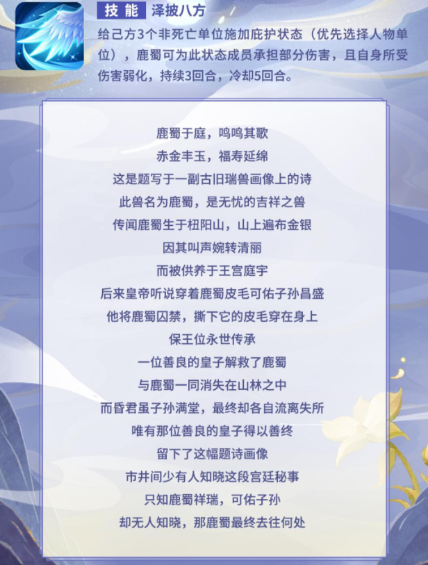 鹿蜀,是传说中庇佑子孙的瑞兽。据《山海经》记载,鹿蜀人面鹿身,鸣叫像歌声一样婉转,而且善良温和,有着令子孙昌盛的吉祥寓意。 其拥有天生技能“泽披八方”,能够给己方3个非死亡单位施加庇护状态,鹿蜀可为此状态成员承担部分伤害,且自身所受伤害弱化。保护我方关键单位,创造胜机。 获得方式: 9月13日开启的【大话庆生宴】,达成五星级宴会即有机会获取; 9月14日正式开启的超级新服【六六大顺】,三轮开服庆典都将抽奖送出鹿蜀; 9月17日晚19:00开启的【生日会直播】,参与弹幕互动即有机会获得; 9月16日维护后,鹿蜀将会增加更多获取方式。 [编辑:sjdieg]