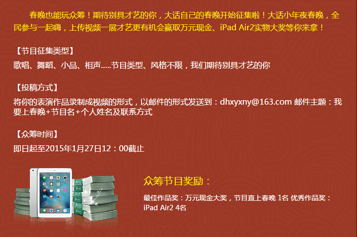 新年到“猴”运来!《大话西游》手游“大话暖心年 遇见真伙伴”小年夜晚会节目正式全面众筹中!参与官网小年夜春晚众筹活动,就有机会赢取万元现金以及iPad Air2实物大奖,最终脱颖而出的玩家众筹节目,还将出现在《大话西游》手游小年夜春晚当中,成为所有大话玩家小年夜关注焦点!这个小年夜,《大话西游》手游春晚与你暖心相伴! 大话暖心福利季 小年夜节目火热众筹中 新年“心”期待,猴年即将到来,《大话西游》手游也为玩家准备了内容丰富的福利玩法、活动,与玩家一道热闹贺年!1月18日,“决战长安”全新玩法正式上线,与玩家相约跨服PK,体验竞技性全面升级的PVP全新玩法!标签智能匹配功、朋友圈功能,也已全面开放,全新升级的游戏社交体验,邀玩家从心遇见真伙伴! 2月2日,《大话西游》手游还将为玩家献上猴年首波暖心福利,推出“大话暖心年 遇见真伙伴”小年夜春节联欢晚会!作为此次新春系列福利活动伊始,本次《大话西游》手游小年夜春晚将首次通过玩家众筹节目的方式,邀请所有玩家秀出最炫的创意节目,成为小年夜晚会的才艺焦点! 众筹才艺上春晚 万元现金大奖等你来 即日起至1月27日12:00时,拥有趣味才艺的所有大话玩家可以将自己录制的创意节目内容(可以是歌曲、舞蹈、相声、小品、魔术、COSPLAY表演等各种趣味节目形式),通过邮件形式发送到游戏小年夜众筹专用邮箱:dhxyxny@163.com,邮件主题:我要上春晚+节目名+个人姓名及联系方式,即可成功参与到大话小年夜玩家众筹节目活动当中!参与游戏小年夜春晚众筹活动,玩家还有机会赢取万元现金以及iPad Air2实物大奖!(最终结果将在游戏官网、微博微信自媒体平台公布) 1月27日12:00时,游戏将从所有玩家提交的众筹节目当中,选出最具趣味性和创意性的节目,作为《大话西游》手游“大话暖心年 遇见真伙伴”小年夜春晚特别展示内容,让玩家和一种明星、红人一起同台演出,陪大家一起热闹迎接猴年的到来!晚会当天,游戏还将联合多家国内知名视频直播平台,全程直播本次大话小年夜晚会!玩家可以通过在线观看以及微博互动的方式,和全国各地的大话玩家分享新春喜悦! 大话暖心福利季,精彩福利享不停。2月2日,《大话西游》手游小年夜春晚即将暖心来袭,玩家节目众筹计划火热征集中!秀出玩家自己的专属才艺,成为所有玩家心中的大话才艺明星,还有机会赢取万元现金以及iPad Air2实物大奖,这个新年《大话西游》手游陪你将热闹进行到底! ▌关于游戏: 大话西游同名手游在玩法上继承了端游的经典玩法。诸如婚姻、家园、庭院、结义、PK、帮战、联赛、皇宫、五环、杀星、挖宝、做天、修罗、地宫、杀塔等大话2玩家所熟知的要素都将在针对智能手机特性优化后加入。而最受大话2玩家喜爱的情义社交体系,如帮派、结义、师徒婚姻系统等也将移植到手游版上。 2015,大话西游同名手游,话回青春,不见不散。 2015,大话西游同名手游,让我们静待这一次的青春到来。 大话西游手游官网:http://xy2.yzz.cn/sy/ 大话西游手游下载:http://www.yzz.cn/ku/dhxy/ 【叶子猪手游通大话手游QQ交流群】 叶子猪为广大玩家提供最活跃的QQ交流社区,在这里你可以畅所欲言,交流心得体会等,Q群更是会不定期内举办活动,越活跃得奖励的机会越大哦。 群号:213794076 [编辑:Dickson]
