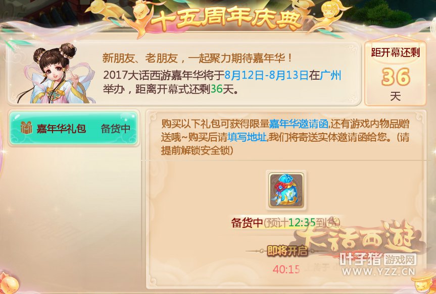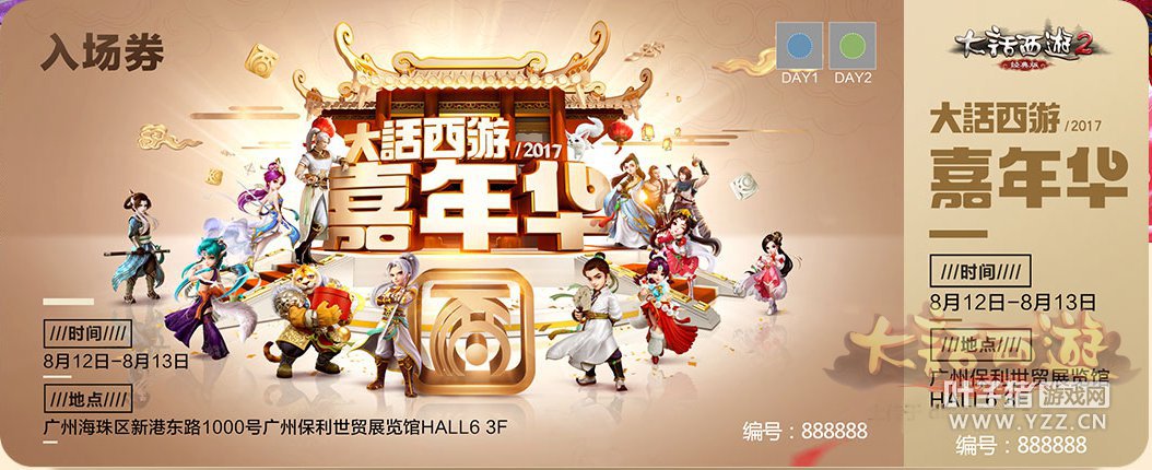 如何购买嘉年华门票? 入场券是进入大话西游嘉年华的唯一凭证,获得入场券的途径如下: a、7月6日起可以在游戏内购买大话西游嘉年华入场券。 b、大话西游官网、论坛、微信公众号的一些活动会放出嘉年华入场券。 嘉年华门票内容 【包含】高级九彩云龙珠*60或神兽属性卡集或珍稀神兽卡集(概率三选一获得),嘉年华门票及实物鸡驴挂件。 【价格】1288仙玉(128.8元) 【销售点】左侧“奖励”按钮-“十五周年庆典” 【售卖时间】2017年7月6日12点35分-2017年7月30日24点 【限购】0转50级以上玩家才可购买,每个ID限购2张 嘉年华门票说明 【举办地】 广州 保利世贸展览馆(广州市海珠区新港东路1000号) 【举办时间】 2017年8月12日10:00-8月12日19:00 2017年8月13日10:00-8月13日18:00 【入场券说明】 1、入场券是玩家进入嘉年华会场的唯一凭证,请玩家妥善保管入场券。 2、入场券为双日多次券;每个持有入场券的玩家可以在8月12日和8月13日进入嘉年华现场进行游园及观战端手游无差别PK赛决赛。 3、玩家凭入场券可以在嘉年华会场签到处领取游园礼包一个。(每张入场券只能在首次入园时领取一个游园礼包) 4、每名玩家都可以凭入场券携带一名身高1.2米以下的儿童。 5、入场券的副券用于8月13日抽神兽活动,请玩家妥善保管;损坏、丢失一律不予补发。 6、大话西游为小朋友们准备了100件儿童版的T恤,先到先得,送完即止。 【游园礼包】 种族T恤一件:玩家可以根据自己的喜好选择T恤上的种族,并可以组队参与游园中的活动。(每个种族数量有限领完即止) 游戏代币四十枚:玩家可以使用代币参加园内游戏,并赢取周边兑换券,兑换稀有周边。 环保袋一个:为了方便玩家携带兑换的周边,我们为每位玩家准备了一个环保袋。 游园地图一张:地图上会详细标注每个游园活动的位置;并且通过玩游戏集印章的活动,集满印章可以在服务台领取额外的奖励代币。 萤光手环一只:每个入场玩家将会获得一个萤光手环,用于参加现场的团体活动。 嘉年华常见问题 Q:嘉年华活动的时间是什么时候? A:2017年8月12日—2017年8月13日(每天10:00开场) Q1:嘉年华的地址在哪里? A1:广东省广州市海珠区新港东路1000号 保利世贸展览馆HALL 3F 地图示意: Q2:线下嘉年华如何入场? A2:可以通过两种途径获得线下嘉年华入场券: a、7月6日起可以在游戏内购买大话西游嘉年华入场券。 b、大话西游官网、论坛、微信公众号的一些活动会放出嘉年华入场券 Q3:游戏内购买“嘉年华礼包”后,如何获得入场券? A3:游戏内购买嘉年华礼包后,我们会把线下嘉年华的入场券邮寄到您提供的地址。 Q4:门票能否多次使用? A4:入场券为双日多次券;每个持有入场券的玩家可以在8月12日和8月13日进入嘉年华现场进行游园及观战端手游无差别PK赛决赛。玩家凭入场券可以在嘉年华会场签到处领取游园礼包一个。(每张入场券只能在首次入园时领取一个游园礼包) Q5:需要带什么凭证到现场?怎样才能领取大话西游2017嘉年华大线下大礼包? A5:入场券是领取嘉年华礼包的唯一凭证,请玩家务必携带入场券至现场。 Q6:我若有事无法参加活动,可以将门票转给朋友吗? A6:可以将门票转给和您一样热爱大话的朋友。 Q7:能否带亲友和孩子进入嘉年华现场? A7:每名玩家都可以凭入场券携带一名身高1.2米以下的儿童,不能携带成年人入场。 Q8:门票入场后是否还有其他作用? A8:入场券的副券用于8月13日抽神兽活动,请玩家妥善保管;损坏、丢失一律不予补发。 Q9:可以带食物和水入场吗?可以带宠物去吗? A9:由于场馆安检规定,活动现场禁止携带任何液体,严禁吸烟和乱扔垃圾。任何宠物谢绝入内,感谢您的合作。 Q10:本次活动是否会提供餐饮服务? A10:嘉年华现场网易“易间”咖啡的工作人员会为您服务,您可以用优惠的价格品尝到“易间”的咖啡和美食。 [编辑:小羽]