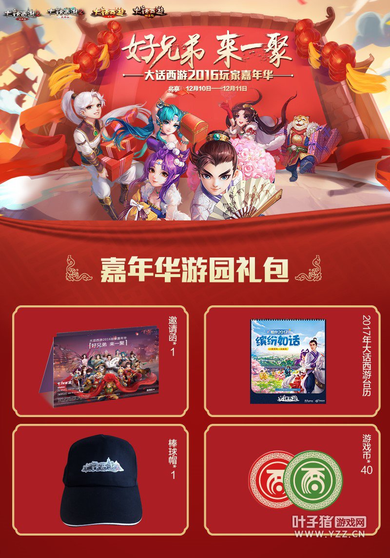 情义如歌,快乐永存!“大话西游2016玩家嘉年华”即将于十二月在北京盛大开幕。作为一场千人线下狂欢聚会,“嘉年华游园礼包”现已为玩家曝光,多重惊喜玩家福利火热来袭!与此同时,本次嘉年华活动专题也已在官网正式上线,体验趣味十足的现场活动内容,珍稀周边好礼赢不停! 嘉年华游园礼包实物曝光 丰厚周边好礼等你拿 十二月,“大话西游2016玩家嘉年华”即将震撼开幕,包含嘉年华入场门票在内的玩家专属礼包已于活动发售当天告罄,玩家反响十分热烈。在嘉年华狂欢盛典即将来袭之际,官方又为玩家带来了“嘉年华游园礼包”的实物内容曝光,独具大话特色的丰厚周边好礼即刻送上! 玩家除了获得“大话西游2016玩家嘉年华”邀请函,届时到达现场的玩家还会获赠精美的大话西游棒球帽、手提袋等大话周边福利以及嘉年华游戏代币、嘉年华游园地图等诸多嘉年华专属好礼,开启欢乐嘉年华游园之旅!此外,更有官方寄出的“2017年大话西游台历”,邀玩家继续珍存与大话相伴的精彩时光!