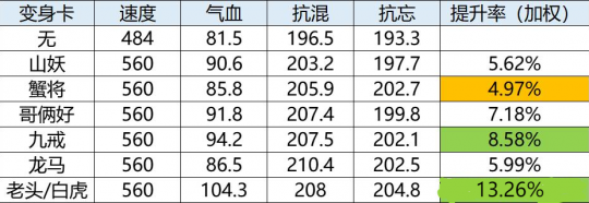 大话西游手游男鬼变身卡属性,大话西游手游男鬼号日常变身卡属性测试,大话手游男鬼变身选择什么属性卡性价比最高?简单测试了几个男鬼主要日常变身卡的属性,供大家参考! 今天休班闲得无聊,碰巧有个闲置不玩了的男鬼号,测试一下供男鬼同胞参考。废话不多说,直接上干货。 大话手游男鬼号测试结果说明: 1、虽然属性卡能直接算出加成,但是这样展示在面板更直观,肯定有误差,但是很小,因为这个号的五行差的不多,都不高,在60左右。 2、速度都控到560,这样更直观展现气血加成。 3、风伯跟山妖速度气血类似,多点抗性就不测了。 4、战神女娲速度跟风伯差不多,气血降低,双抗跟山妖一样,明显垃圾卡不测了。 5、本帖测试日常卡,罗刹、复活女娲这种直接缺个关键属性的瘸腿卡也不测了,19星缺10点抗遗忘根本不配上桌。 6、表格中提升率是加权后的,因为气血、抗忘、抗混对男鬼重要程度一样,所以各取三分之一权重。 最后,九戒卡真香,我愿称之为日常第一性价比卡,属性均衡,气血百分比加成高,远远不是牺牲的那点根骨属性能比的。最佳选择是带个鹿蜀,再加上小孩技能横刀立马,力保3个回合不倒。白泽卡已经很优秀了,要么就变玄武或者老头卡,毕竟克水的仙比较少。 一般一个男鬼19星闪躲套,600速度基本都是60多万裸血,变龙马卡70万血,变九戒80万血,如果男人或者输出不给力,这10万血的重要性你就知道了,19星抗混没什么用,因为男鬼比对面的混要快,回完血即使被控住也没影响,我变九戒卡204抗混,感觉已经够用了,基本不会被混住,剩下心魔17 18星我地藏套215抗混,还真没压力! 我天策符全满的,所以日常我都习惯吃个五行变晶,我不知道19星有没有克金这一说,我自己测试是没有的。其实心魔17这种任务,有泽披随便抗,没泽披怎么也扛不住,18星这种随便来个鬼都能抗住,任务来说五行不重要。 [编辑:ssc]